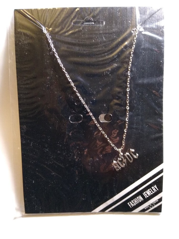 This is an AC/DC logo necklace, presented as fashion jewelry. The necklace features a silver-tone chain with a pendant clearly displaying the iconic AC/DC band logo. This piece is ideal for fans of rock and roll music, AC/DC enthusiasts, and collectors of music memorabilia.
