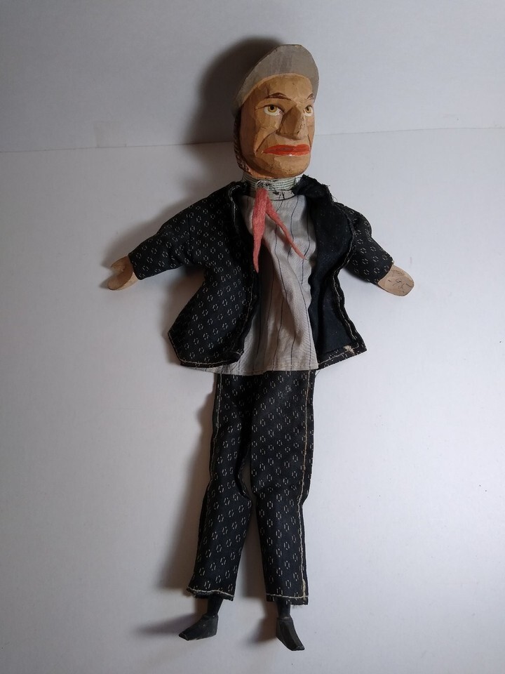 Vintage hand carved finger puppet. Most likely made in Italy. ANRI folk art black forest style. The head is wood with hand painted features. Wood hands and feet. Fabric clothing. Wood is in good condition. Clothing has soiling, fraying, small tears, and age wear. See photos for more details.
