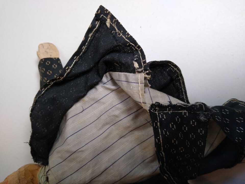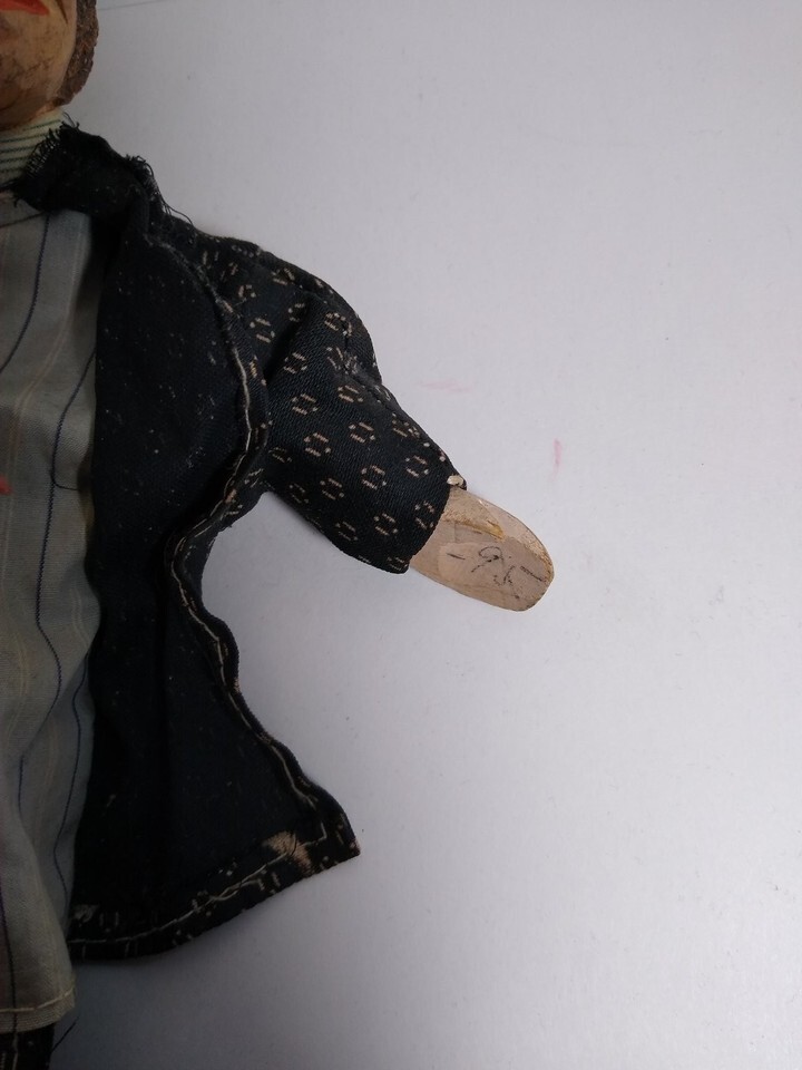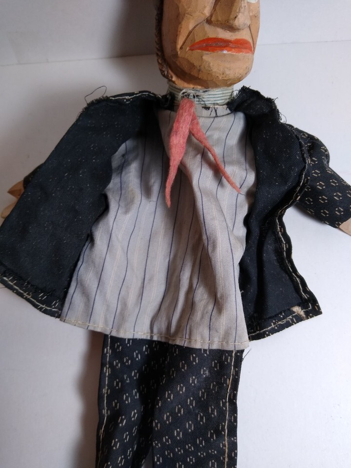 This listing features a unique hand puppet with a hand-carved wooden head and wooden feet, dressed in patterned cloth clothing. The puppet wears a black patterned jacket and pants with a striped shirt underneath, and a red felt necktie. The head is finely detailed with carved hair and painted facial features including yellow eyes and red lips. The puppet measures approx. 12 inches in height as visible in the images. Notably, the puppet's arms and legs are jointed but there is no visible control rod or crossbar included. The puppet appears to be handmade and originates from Italy, as indicated by the handwritten '20' marking inside the jacket and the overall style. The puppet is loose without packaging or tags. This item is suitable for collectors interested in traditional European puppetry or unique hand puppets crafted from wood and cloth.