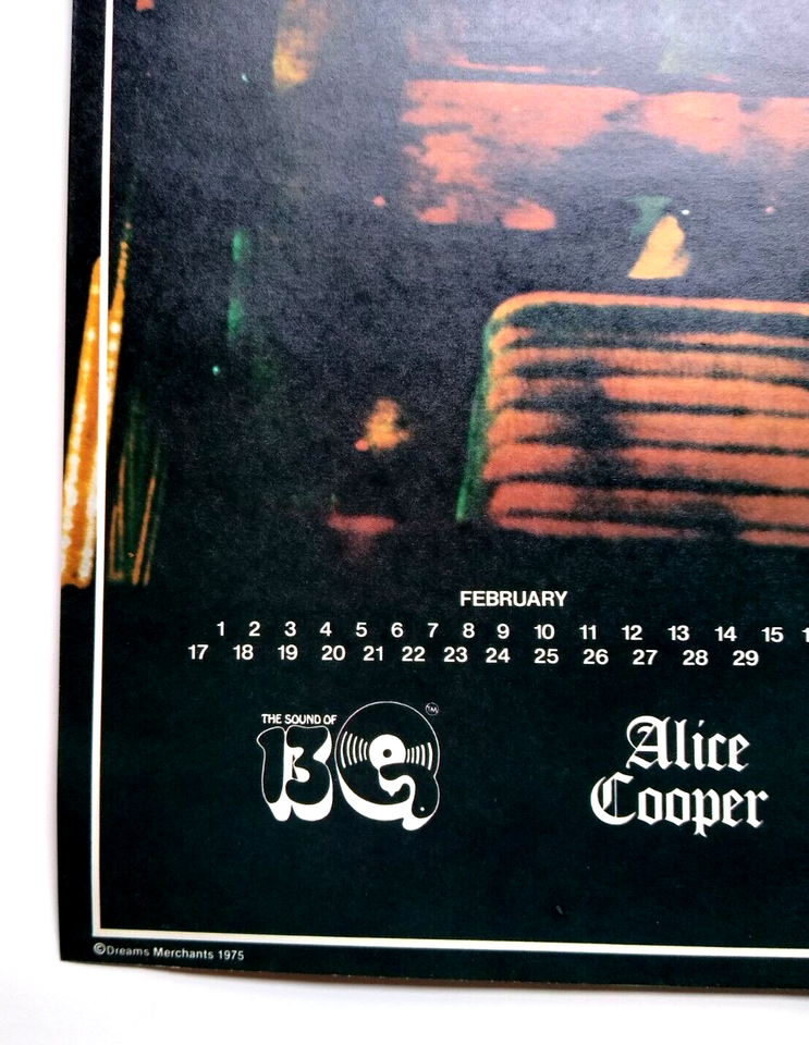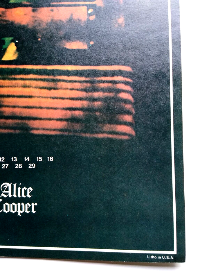 The one and only Alice Cooper. Poster shows him on stage with guillotine which is part of his Halloween Horror themed shock rock music show. Vintage 22" x 12.25" licensed wall poster. These were the first glossy licensed paper posters ever produced featuring rock stars. Dream Merchants issued a different one each month for a 1975 year. Now, they are very scarce. Super nice UNUSED condition with light age wear.