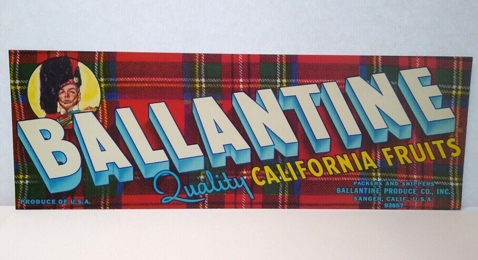 Ballantine California Fruits Scottish Plaid Marching Band Man Crate Label 1960's