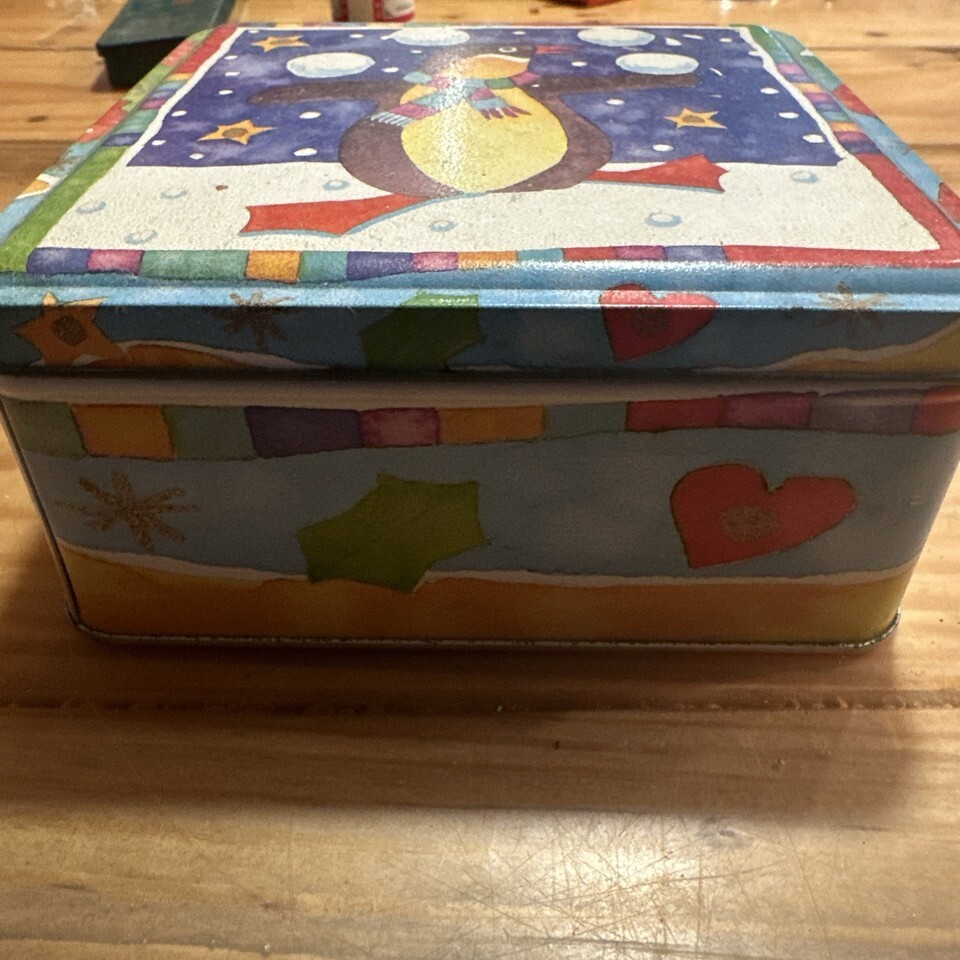 The Christmas penguin metal decorative holiday box features a festive snowman pattern, making it a charming addition to your holiday decor. This handmade, original piece is crafted from metal with a multi-color paint job, adding a touch of whimsy to your home. With a rectangular shape and dimensions of 6.5 inches in length and width, and 3 inches in height, this decorative box is perfect for storing small holiday trinkets or ornaments. The painted lid and box design, along with its holiday theme, make it a delightful gift or early Christmas present for yourself.