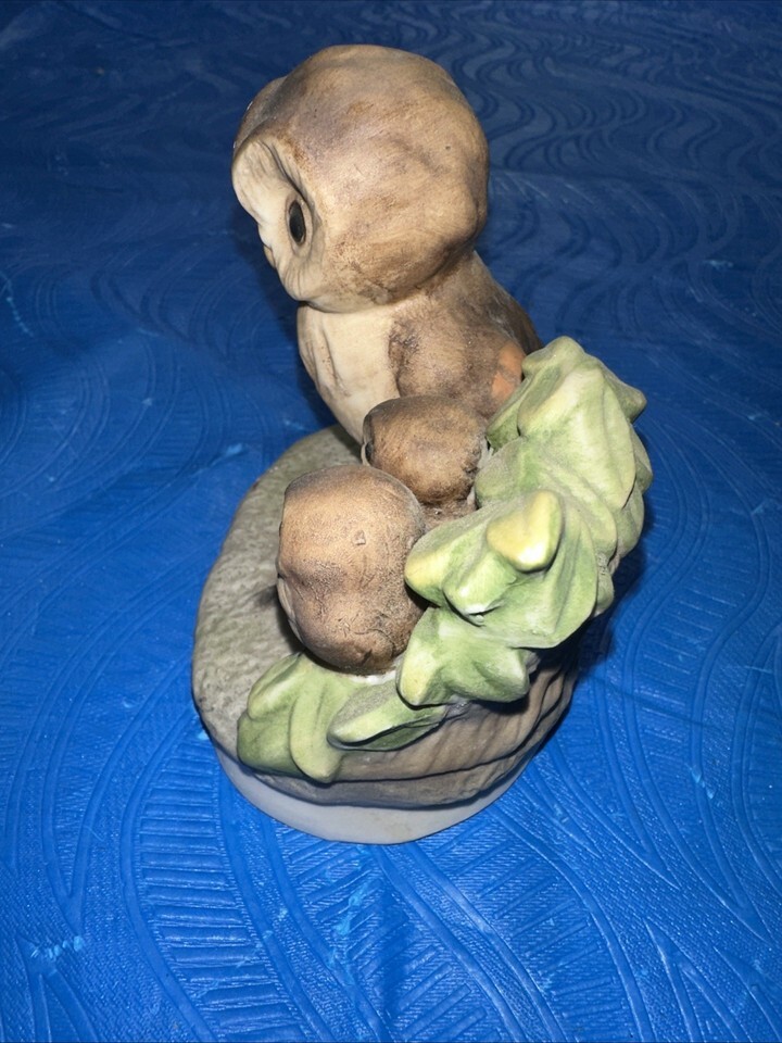 The product is a charming vintage ceramic figurine depicting a mama owl with two baby owls, known as owlets. The figurine is marked as being made in Korea, Republic of, adding a unique touch to its craftsmanship. Standing at 4 inches tall, this collectible piece would make a delightful addition to any collection of animal-themed figurines, especially for those who appreciate birds and owls in particular.