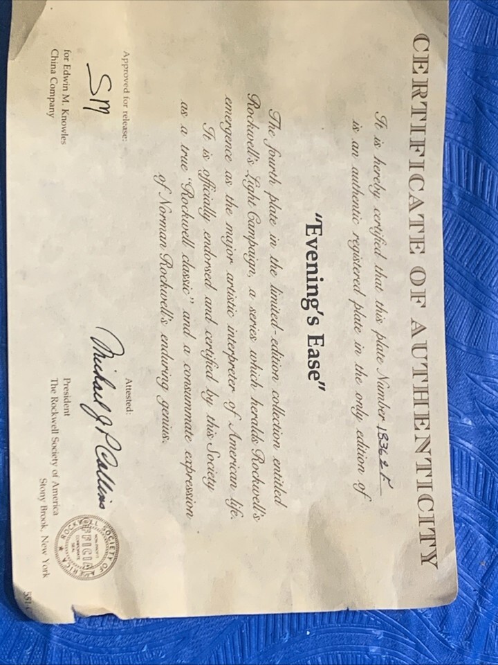 The Rockwell's Light Campaign Series Evening's Ease Plate #18362F is a decorative collector plate featuring a scene from a Rockwell illustration. This plate is a part of a series aimed at bringing a sense of calm and relaxation to the viewer, making it a perfect addition to any collector's display. With its nostalgic design and high-quality construction, this plate would make a lovely addition to any home decor or collection.