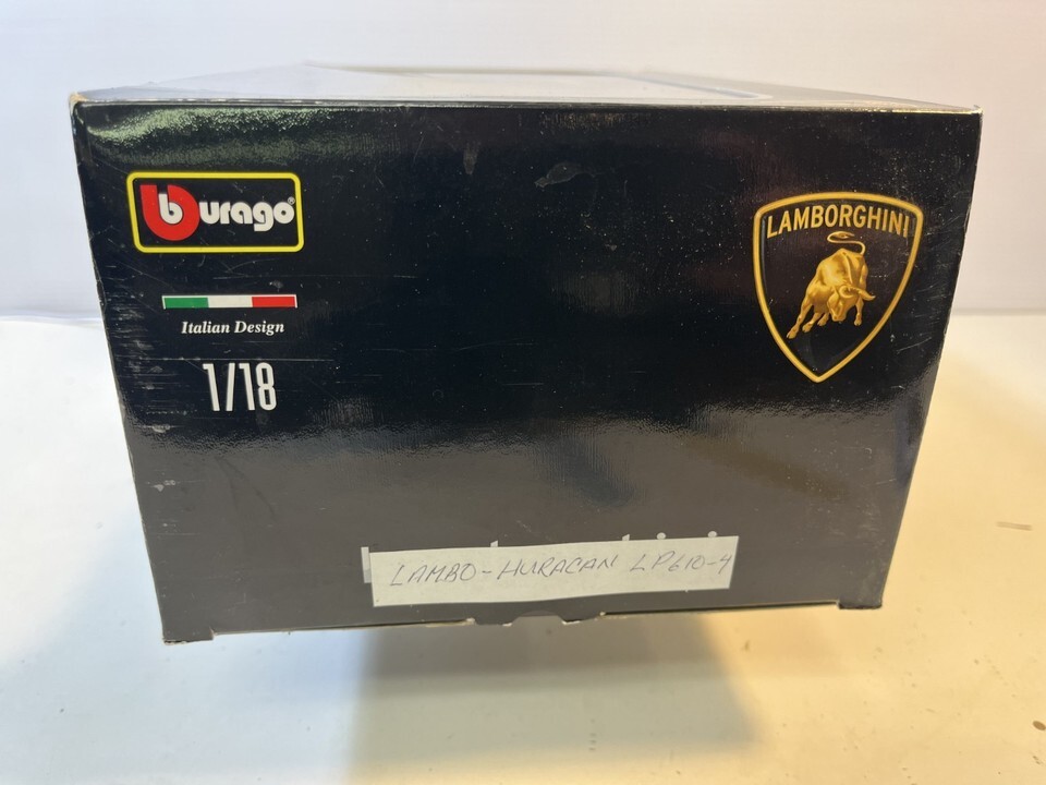 Lamborghini Huracan LP610-4 Diecast Model Car: 1/18 Scale By Bburago. This Diecast car checks all the boxes for a reasonably priced rendition of the classic die cast Lamborghini Huracan LP610-4. This is a used car. Please review pictures carefully before purchasing.