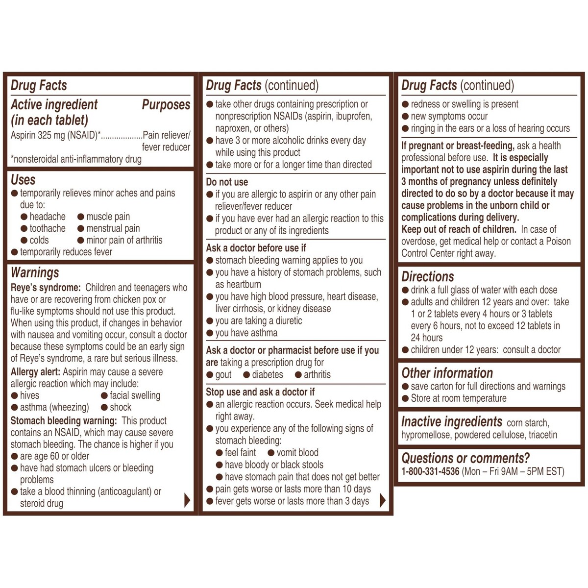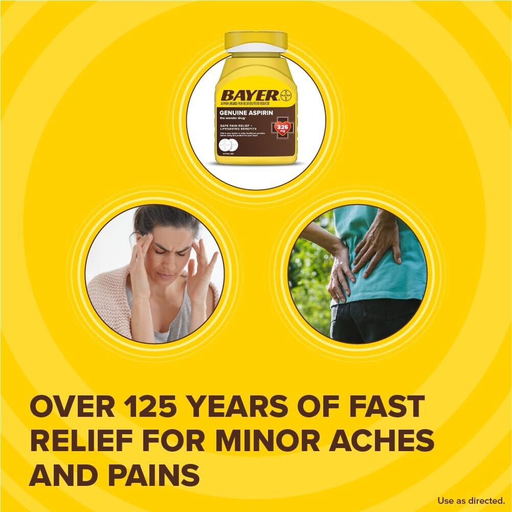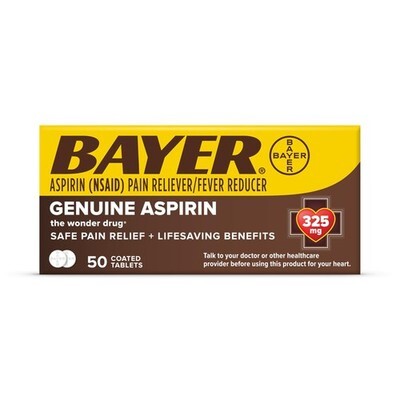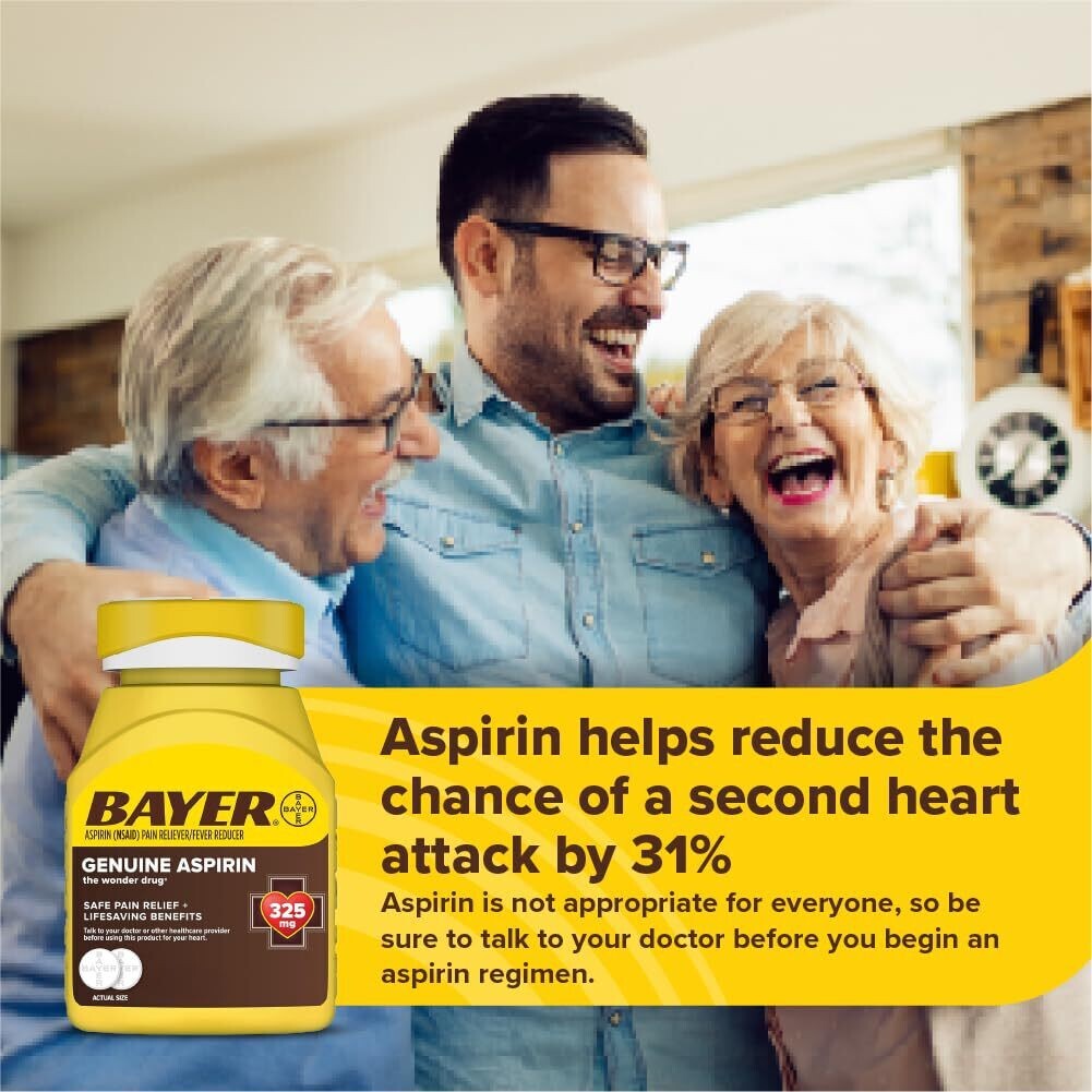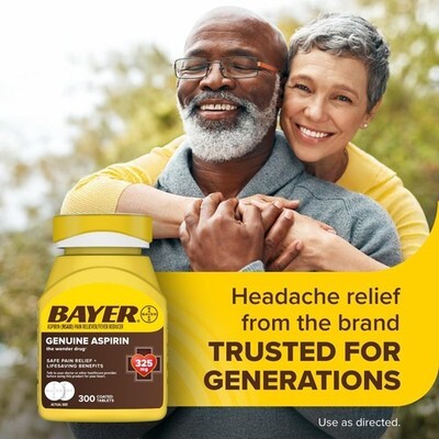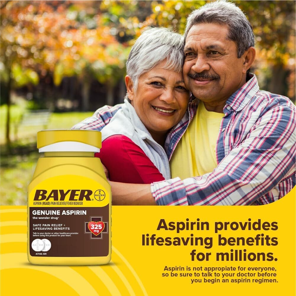 2 Boxes Expiration Date of 10/2026 ? 325 Mg Per Tablet: Each coated tablet of Genuine Bayer Aspirin contains 325 mg of aspirin (NSAID)* for effective headache and multi-symptom pain relief ? Headache Relief: Provides proven headache relief so you can get back to your day with confidence ? Multi-Symptom Pain Reliever and Fever Reducer: Relieves tooth pain, backache, muscle aches, menstrual pain, and minor arthritis pain, and also reduces fever ? Easy to Swallow: Each pain relief tablet is coated for easy swallowing and is free of caffeine and sodium ? Over 125 Years of Pain Relief: Bayer has been providing safe, effective pain relief for over a century when used as directed. ? Helps Prevent Another Heart Attack or Ischemic Stroke: When directed by a doctor, Bayer Aspirin can help prevent another heart attack or clot-related (ischemic) stroke. Aspirin is not appropriate for everyone, so be sure to talk to your doctor before you begin an aspirin regimen.