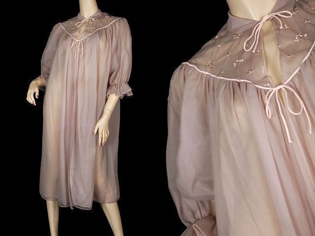 Double layer nylon chiffon housecoat with pale pink under smoky lavender. It has a sheer embroidered yoke that ties at the neck and mid bust with pale pink piping.