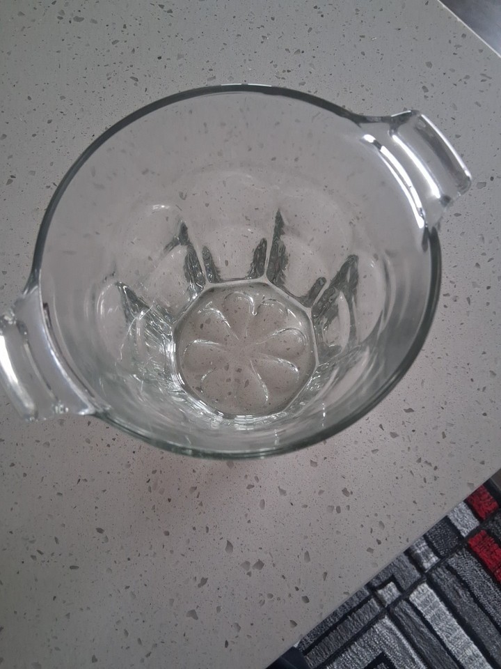 This vintage crystal glass ice bucket with handles is a classic and elegant addition to any home bar or kitchen. The round shape, glossy finish, and clear color make it a versatile piece that will complement any decor. With a size of 6.5 x 6 inches, this original unmarked ice bucket is perfect for keeping drinks cold and stylishly serving beverages at any special occasion. Made of high-quality glass, this vintage piece is sure to add a touch of sophistication to your drinkware collection.