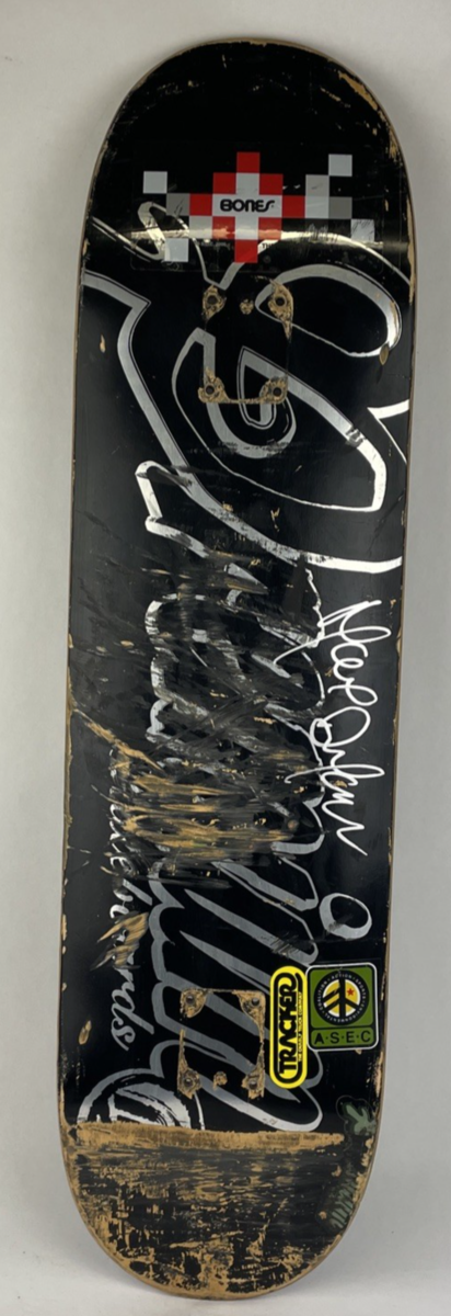 Premium Skateboards Max Dufour " Skated / Used By / Autographed / Signed " Skateboard Deck w Tracker Trucks , A.S.E.C , Bones Bearings Stickers