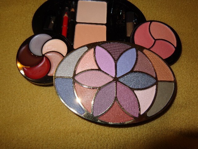 Includes one eyeshadow palette, one blush palette, one lipstick palette, 2 shades of face powder, one tiny black eye pencil, one tiny red lip liner, one tiny blush brush, and one pencil sharpener. Two slots are empty- there may have been other applicators in there but they are now missing. This has a round mirror under the lid. There are a few accidental smudges on the products, but nothing has ever been used. Case measures approximately 6 inches by 4.5 inches.