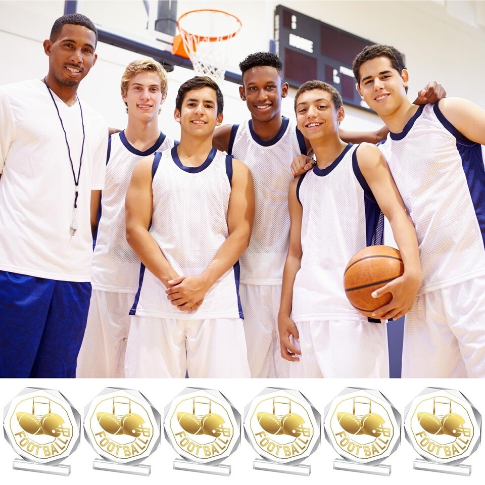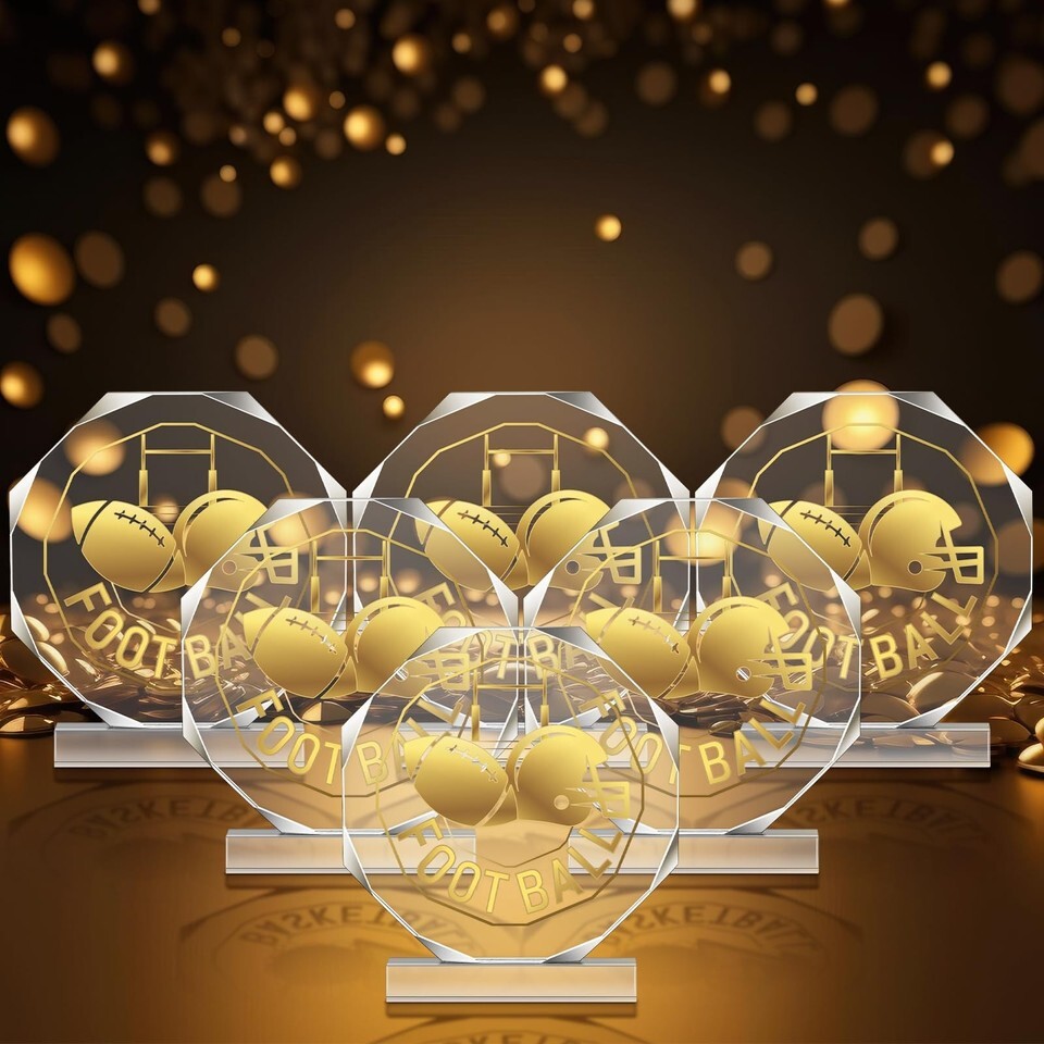 You Will Receive: 6 football trophies; This set of 6 is appropriate for honoring the entire team or giving recognition to individual participants; Elegantly crafted, these trophies would become cherished keepsakes to remember a victorious season for years to come,Quality Material: this trophy plaque is crafted with quality acrylic, ensuring excellent durability, long lasting use, and reliability; Featuring glossy gold and transparent shades, it boasts a classic pattern that epitomizes the true essence of the sport,Appropriate Size: with dimensions of 4.72 x 4.72 inches, the compact size of the football medal makes it easy to handle and display; Despite the size, it stands with a robust demeanor, highlighting its sturdy build, which is a result of its quality acrylic construct; The size of base plate is about 3.54 x 0.59 inches,Attractive Display: with its textured gold and clear acrylic patterns, this trophy is more than just an award; It's a decorative piece that recipients will be proud to showcase; Even after years, it continues to shine brightly, reminding the holder of the fun, intense sports games,Recognition and Reward: whether you are rewarding winners of football games or presenting football party gifts, these football trophy awards cater magnificently; Be it for a kids' football match or an adults' tournament, these trophies serve as a thoughtful yet impressive prize