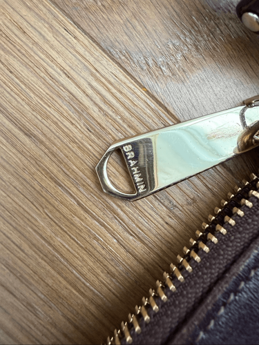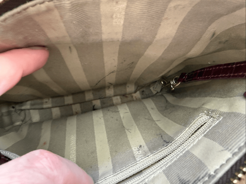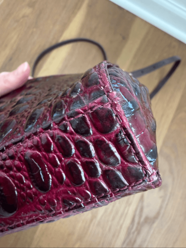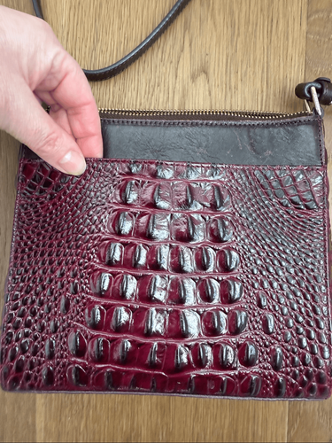 Brahmin mimosa burgundy croc embossed leather with gold tone, embossed hardware and calf hair front pocket in animal print. The calf hair is worn off along the top seam and the interior of that pocket is lined with card, slots and windows for your ID and other cards. Turlock closure on the pocket and zip closure on the body of the bag. The bag itself measures 8 1/2? x 8? and the adjustable strap is approximately 24.5 inch drop at the longest setting and 1.5 inches deep. Fabric lining with attached key fob and internal zipper pocket. There are pen marks on the internal textile lining. I have not attended to them since they aren?t visible from the outside. Priced accordingly.