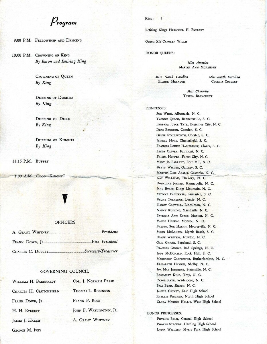 A 4 page Royal Society of Knights of Carrousel 6th Annual Ball Program. Held on November 27, 1957. In the program is a list of officers, Honor Queens including Miss America Marian Ann McKnight and Miss North Carolina Elaine Herndon, Miss South Carolina Cecelia Colvert and Miss Charlotte Teresa Blanchett. Also a long list of Princesses, Honor Princesses, Kings, Baron, Dukes, Duchesses, Friars and Knights.