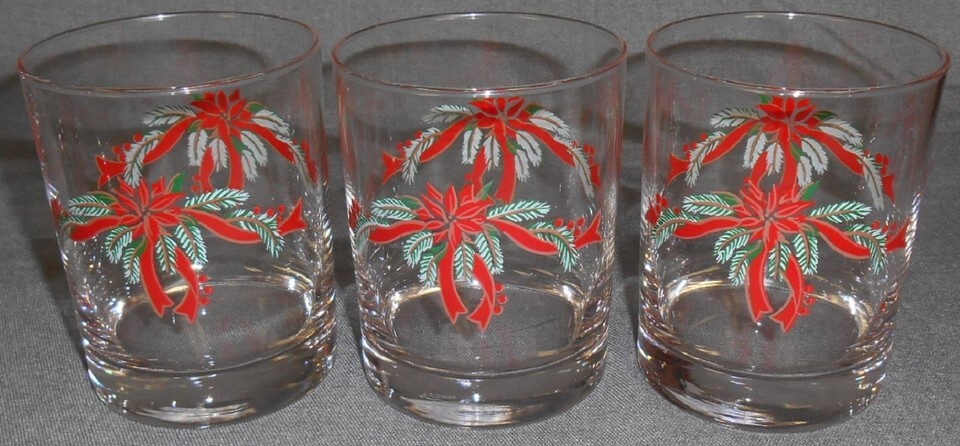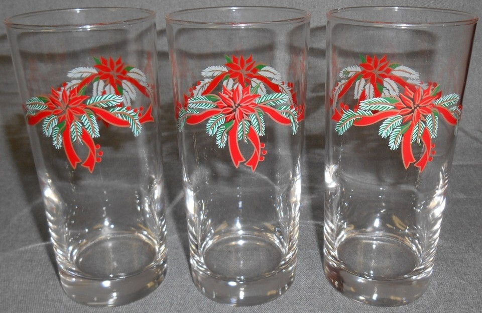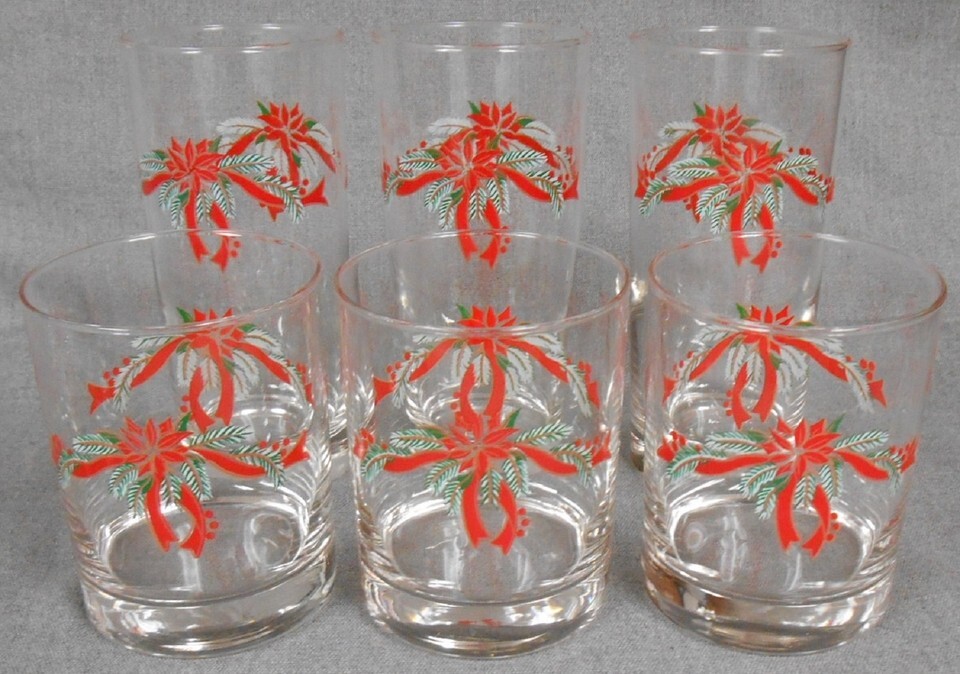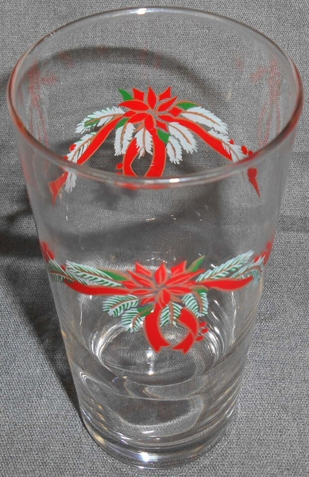 Set (6) Anchor Hocking POINSETTIA & HOLLY PATTERN Glass Tumblers CHRISTMAS