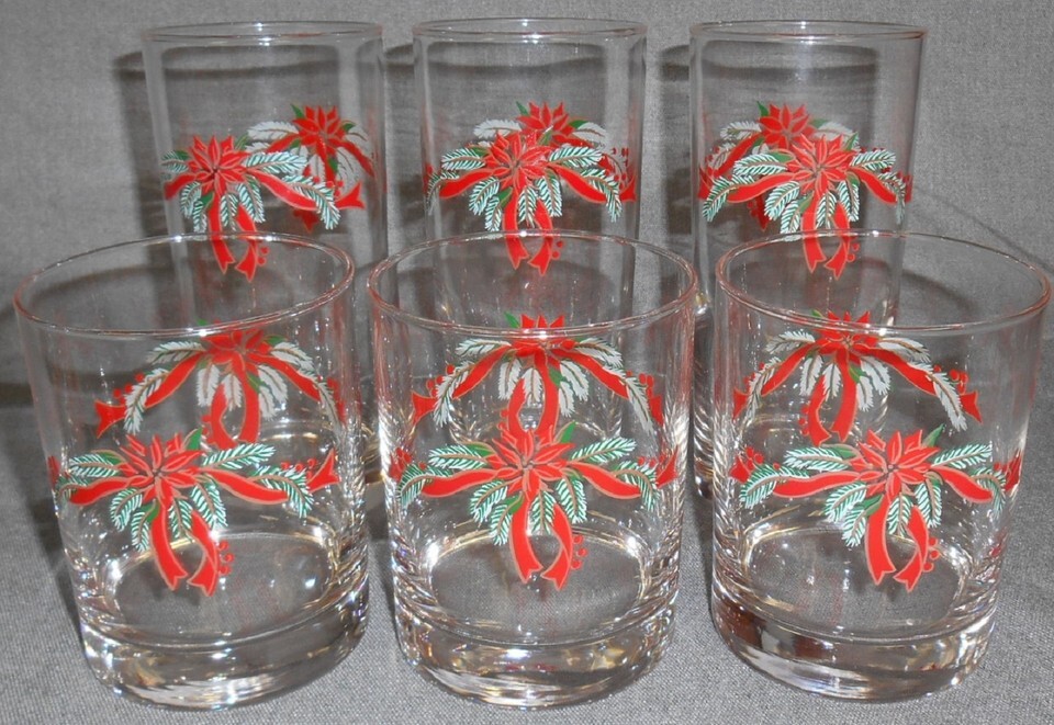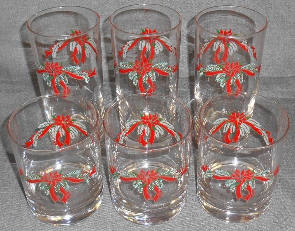 This is a set of (3) 4 1/4" Tall 12 oz. Double Old Fashioned Tumblers and (3) 6 1/4" 14 oz. Tall Tumblers from Anchor Hocking in the Christmas Poinsettia and Holly with Ribbons Pattern. All six are in good pre-owned condition with no chips or damage.