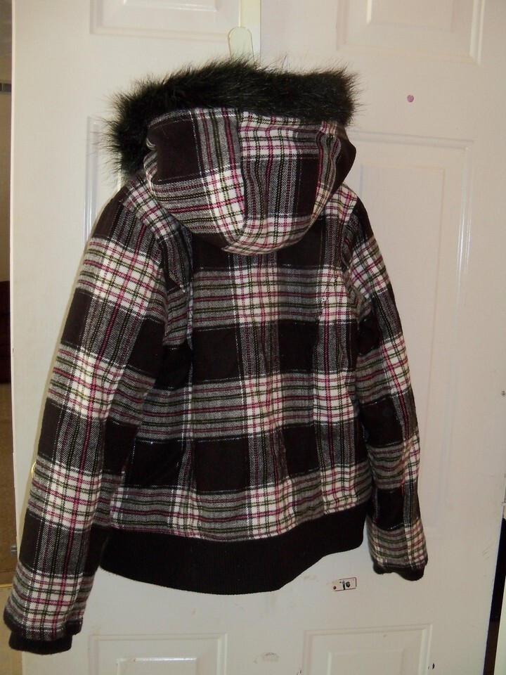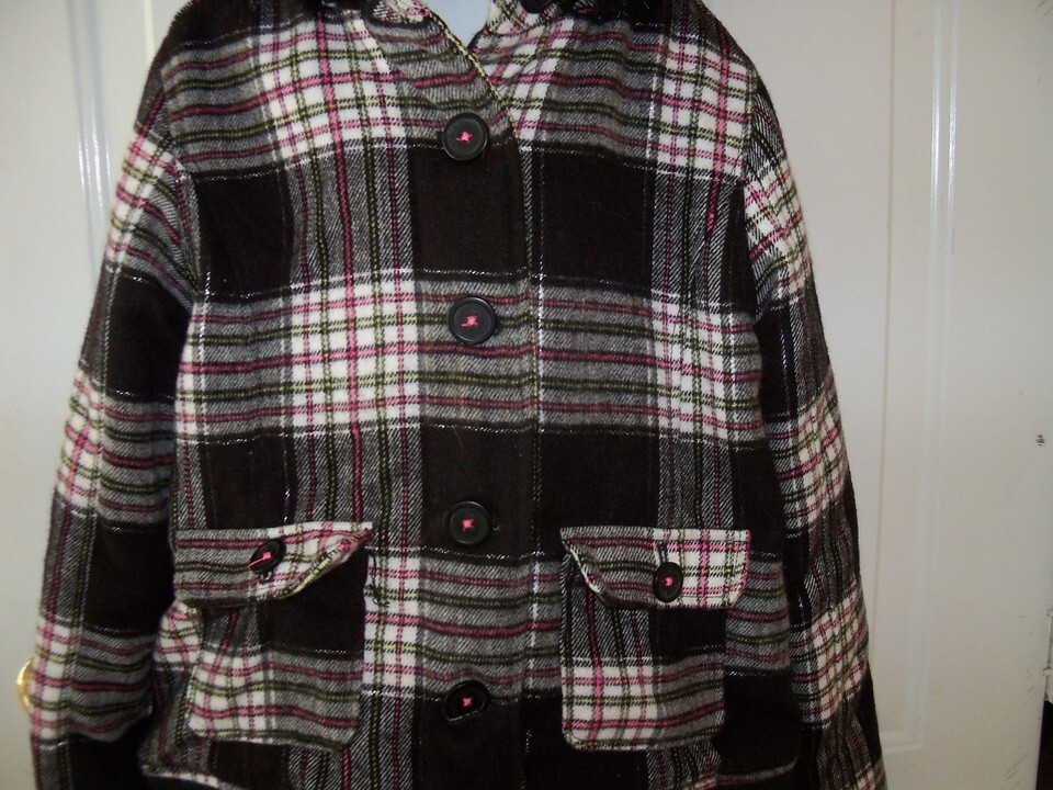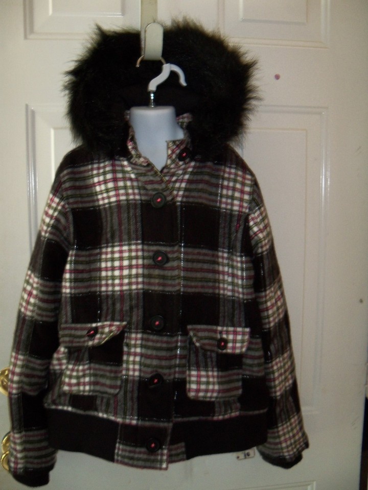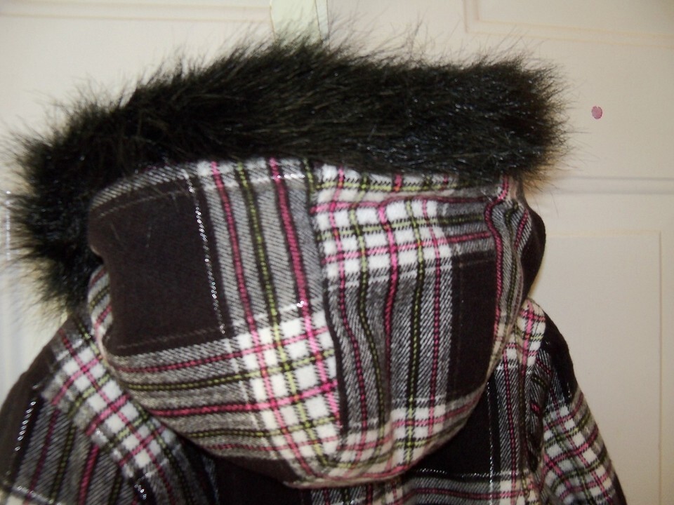 JUSTICE BLACK PLAID COAT W/ Detachable Fur Hood Size 14 EUC
