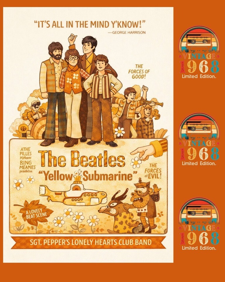The product is a rare set of three posters from 1968 featuring iconic music artist The Beatles, inspired by their animated film "Yellow Submarine." These 16x20 posters were created in the United States and are a unique piece of music memorabilia for fans of the rock and pop genre. Perfect for collectors or enthusiasts of the Beatles, these posters offer a nostalgic glimpse into the vibrant and creative world of the band during that era.
