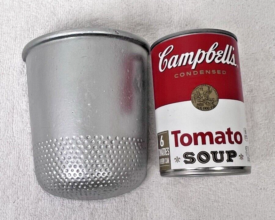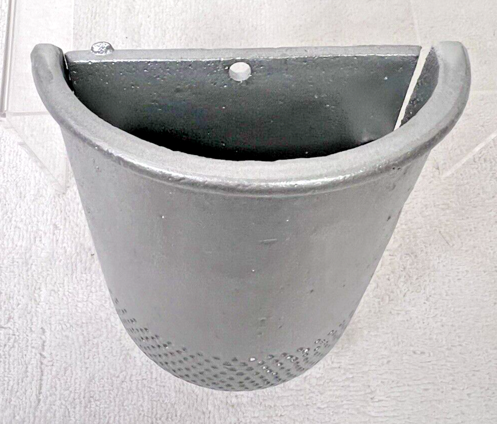 Vintage Metal Sewing Thimble Wallpocket Wall Pocket Silver Tone Metal 4.5 across top rim 3.5 across base 4 3/4 long and 2 1/8 inches deep. It won't hold water and we have highlighted a "dent' that is under the paint we think it was a mold issue it is just the way it was made