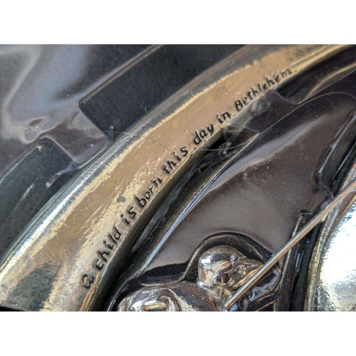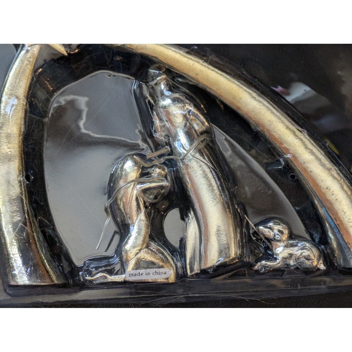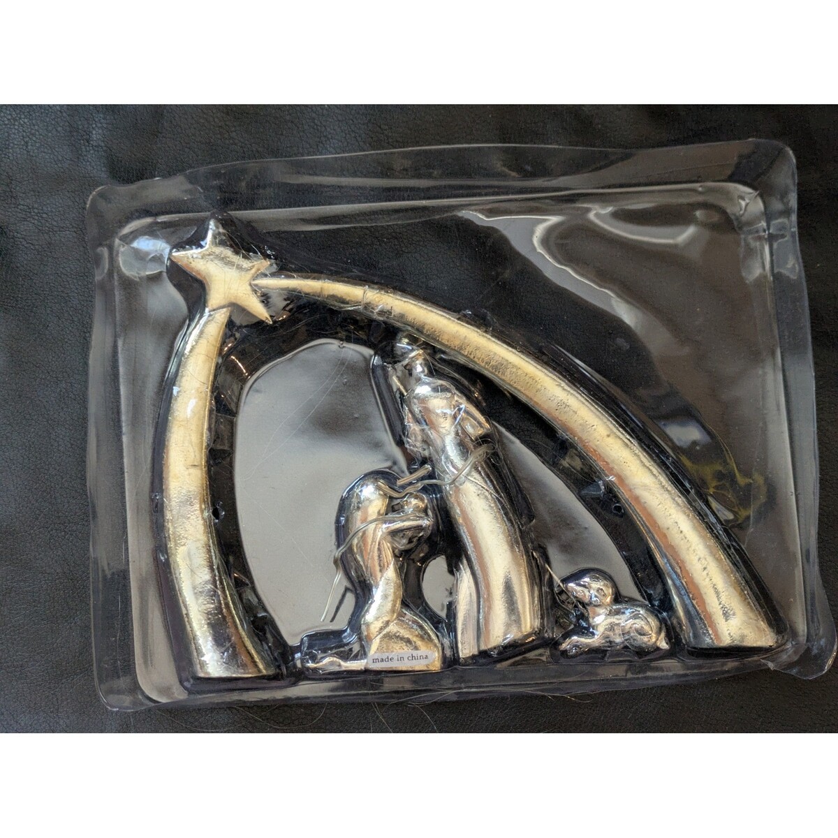 Silver tone nativity scene figurine set features a modern, fluid design with Mary, Joseph, and the Baby Jesus under a shooting star arch. The arch is elegantly inscribed with the phrase "a child is born this day in Bethlehem." This miniature religious display includes a small lamb figure, all finished in a polished metallic sheen. Perfect for Christmas mantel decor or as a thoughtful holiday gift, this set remains in its original plastic tray packaging.