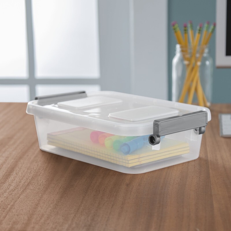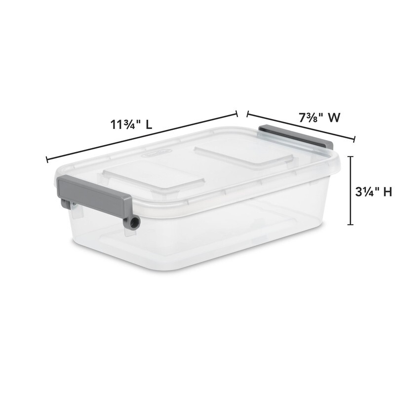 Outside Dimensions: 11 3/4" x 7 3/8" x 3 1/4" Use the 2.7 Qt size for organizing your living spaces - store health and beauty items, accessories, craft supplies, and more Single unit option Clear base and lid allow contents to be viewed at a glance, making them easy to find - Titanium Interior Dimensions at bottom: 9 1/2" x 6" x 2 5/8" Write-on ID Latches make personalizing storage easy Ideal for a variety of small storage needs Dry-erase markers easily erase if relabeling is needed Stack for efficient use of vertical storage space BPA-free and phthalate-free