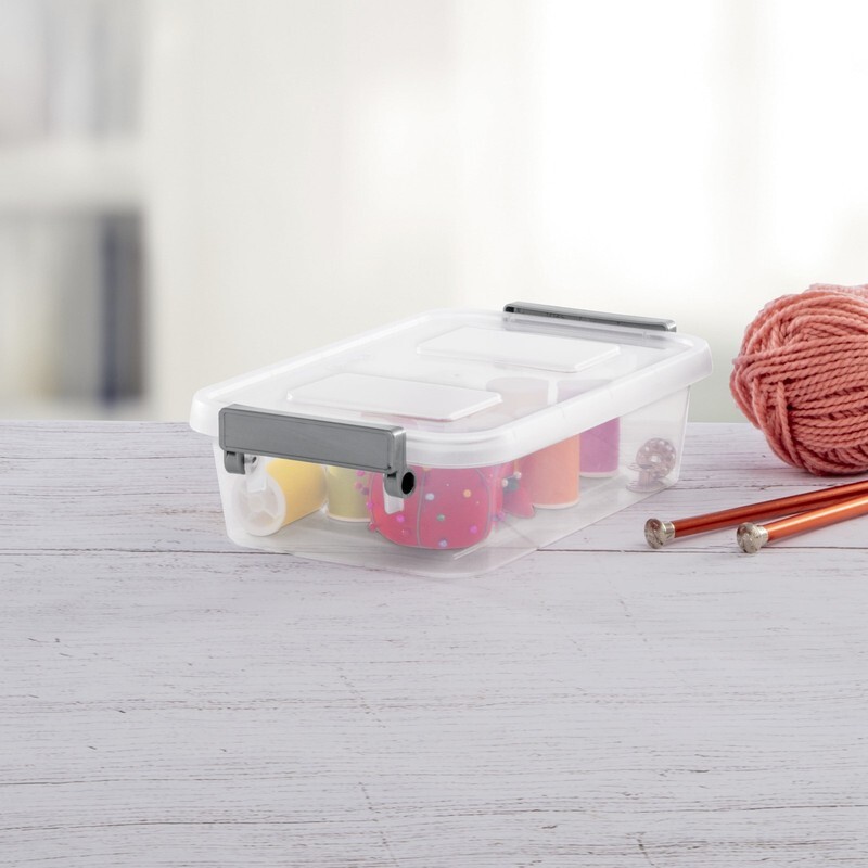 Sterilite's Modular Latch Boxes help make small storage organization easy! Available in a wide range of sizes and designed to stack and use vertical storage space efficiently. The color accented write-on latches keep the covers secured to the base while providing a space for labeling, making personalization simple! Label by contents, activity, or by name, use a dry-erase marker to erase and re-label as necessary or apply a standard adhesive label. Use the 2.7 Qt size for organizing closets, craft areas, play rooms, office spaces, bathrooms, workshops and more! Keep health and beauty items, accessories, and craft supplies, neat and contained, where they are most frequently used. Its clear base and lid allow items to be viewed from any angle. The 2.7 Qt and 5.5 Qt have the same size lid, allowing shallow and deep containers to stack in the same footprint. The overall assembled dimensions of this item are 11 3/4" L x 7 3/8" W x 3 1/4" H.