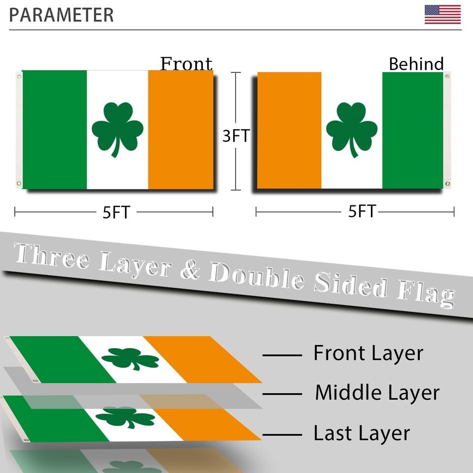 [Non-Rust Brass Grommets]? Ireland Flag 3x5 with Shamrock has thick canvas cloth header and 2 non-rust brass grommets,strong and fade resistant,can securely fastened a flying flag,[Durable Strongest ]? METDIRU Ireland St Patricks Flag is double sided with three layer,durable and high strength wear resistance,can display the pattern correctly from any side,[Wear Resistance Wrinkle Resistance]? 3x5 ft Ireland flag each stripe has double stitched.The hemming is sewing 4 rows,to improve wind resistance .It will not be easily damaged in harsh outdoor weather,[Best Color]? The Irish republic flag fabric has undergone special anti fading treatment,even exposed to the scorching sun for a long time, this flag still have vibrant color. It would outlast your neighbors' and stay vivid as long as you need it,[Customer Satisfication]? We have done fully quality inspection on every national flag, shipment make sure that all the details are well done.If there is a quality problem with the product or you are not satisfied,please contact us in time