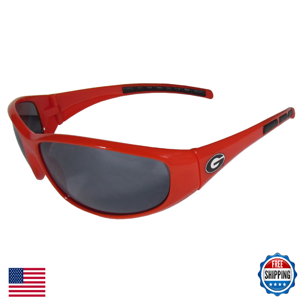 Description Whether you're in the stadium cheering your Georgia Bulldogs to victory, driving or just lounging by the pool these stylish shades are the perfect accessory with a 100% UVA/UVB rating for maximum UV protection. The light-weight frames are built to last with flex hinges for comfort and durability. The colorful rubber grips on the arms of these fashionable sunglasses make them perfect for someone with an active lifestyle. Whether you are hiking, fishing, boating, running on the beach, golfing or playing your favorite sport these designer frames will stay in place for all of your outdoor activities. Our wrap sunglasses are true quality eyewear at an affordable price. Their classic wrap style is accented with bright team colors and team logos on both arms so you can show off your die-hard team pride while protecting your eyes from those bright sun rays.