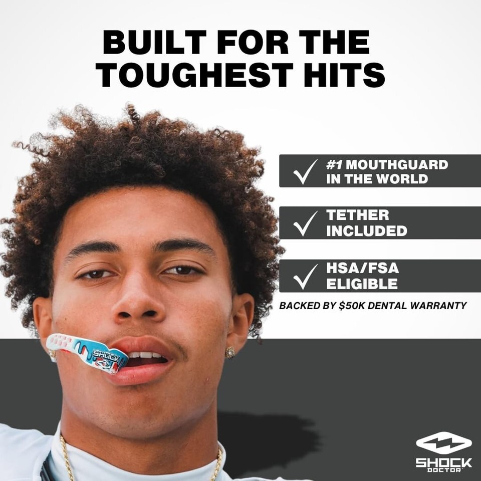 Finding the perfect mouth guard can be a daunting task. . . Trying to find the right fit, that protects but is also comfortable and easy to wear. Some of us have purchased so many, only to throw it out for various reasons. The search is over! ! The Shock Doctor Gel Max Power Carbon Convertible Strap Mouth guard is the only choice for your sport and preventative needs, this mouth guard is the future of tooth and jaw protection. Shock Doctor has made their best mouth guard even better, by improving the gel-fit liner where your teeth sit. The Gel Max is now easier to fit correctly. In addition, they've engineered the mouth guard to have a convertible tether so you can wear your Gel Max strapped or strapless. All these improvements were made without sacrificing the great fit, comfort and protection you expect from the always reliable, never-fail Gel Max Mouth guard. Features: Exoskeletal Shock Frame provides impact protection Ultimate custom gel fit technology, comfortable fit Multi-Layer construction with an internal shock-absorbing frame offers protection and fit that outperforms all conventional mouth guards. Offered in an assortment of colors to match uniforms, or as a personal preference. Convertible Tether to use strapped or strapless, it is up to you! Shock Doctor, the undisputed leader in mouth guard technology and the #1 mouth guard in the world, has become a leader in sports protection and performance around the globe. Our continual innovation in performance-driven and protective equipment is trusted fearless pro and youth athletes. Shock Doctor products are worn by hundreds of professional and college athletes around the world. Shock Doctor offers a full line of preventative and support wear and tools, feel free to click the link above to view all our knee, waist, ankle and other active support wear, as well as gloves and hydration tools to fulfill a sound mind as well as body. 100% SATISFACTION ! !