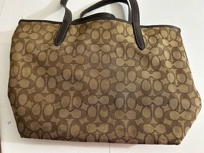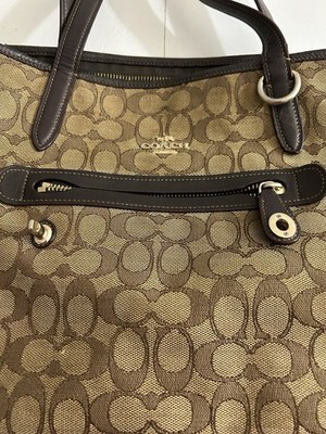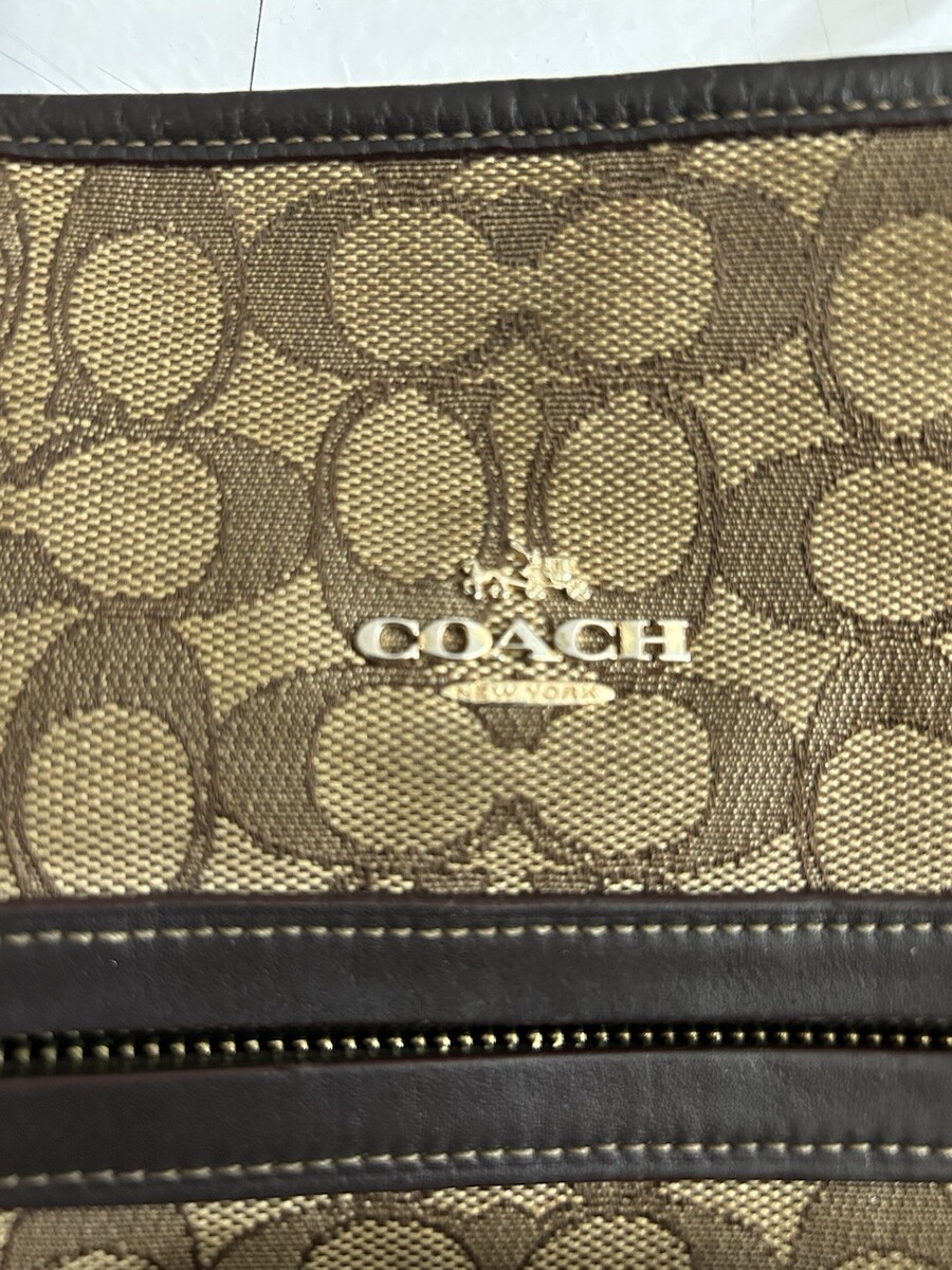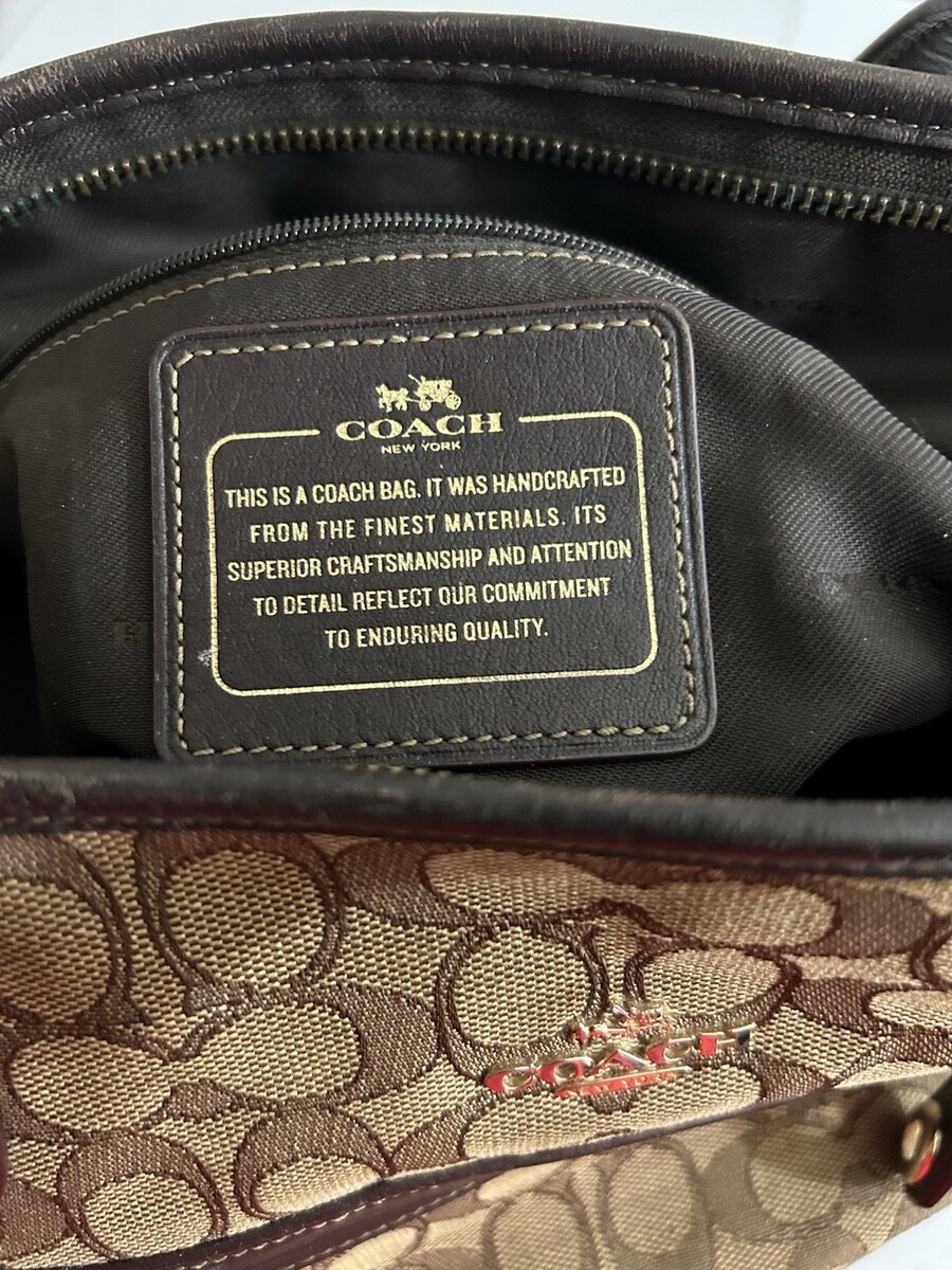 The Brown and Gold Coach Handbag is a stylish medium-sized shoulder bag designed for women. It features a crossbody strap handle in gold with adjustable length for added comfort. The exterior is made of canvas with a brown color, while the hardware is gold. The lining is beige and the overall style is elegant and versatile, perfect for various occasions. With its classic Coach brand and luxurious design, this handbag combines fashion and functionality for a chic accessory.