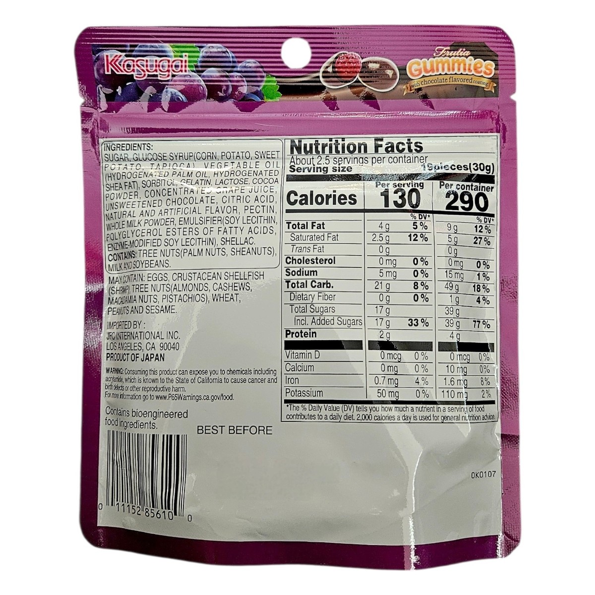 The listing is for one (1) pack of Kasugai Frutia Japanese Chocolate Gummy Grape 70g, Free Shipping