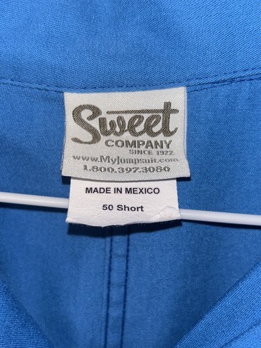 This vintage blue coverall jumpsuit by Sweet Company is a must-have for anyone looking for a unique addition to their work wardrobe. Made from a comfortable cotton blend material, this jumpsuit is perfect for mechanics and other industry professionals who want to stay comfortable while on the job. The jumpsuit features a blue color and is sized at 50 Short, making it a great fit for those in need of a comfortable and stylish work outfit.