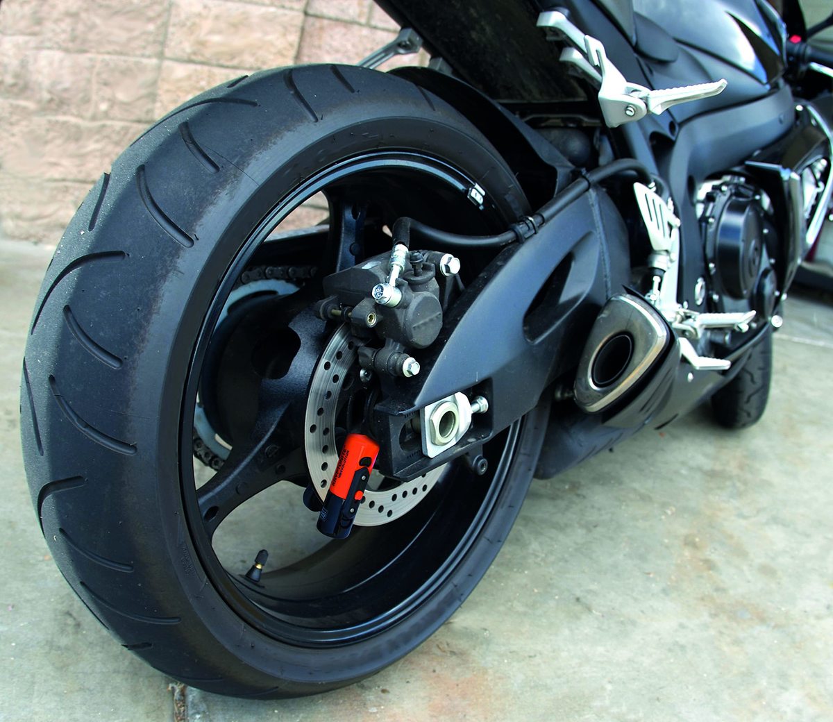 The innovative flat-top plate design of the Evolution compact disc lock is short in height allowing the lock to attach to the rotors spider in more than one location requiring 2 cuts to be defeated. It has a 13mm Hardened Max-Performance steel shackle that resists bolt cutters and leverage attacks as well as a HARDENED DOUBLE DEADBOLT design giving additional protection against twist attacks. The Evolution compact disc lock also includes a handy bright orange REMINDER CABLE to prevent riding away while disc lock is engaged.