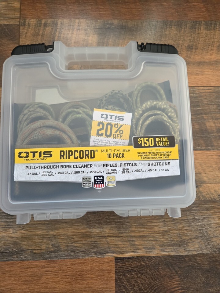 Includes Ripcord one pass bore cleaners to clean most popular calibers/gauges of rifles, pistols shotguns