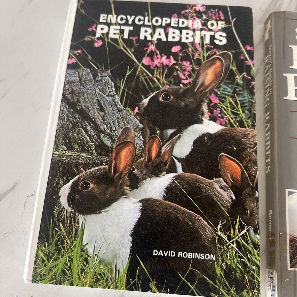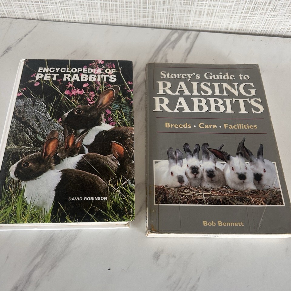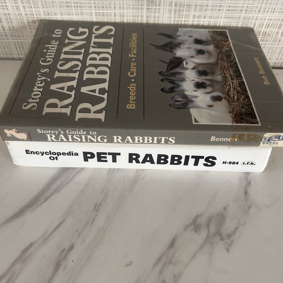 Pre-owned, good condition. Storey's Guide to Raising rabbits is an ex-library softcover book. Encyclopedia of Pet Rabbits is a hard cover book.