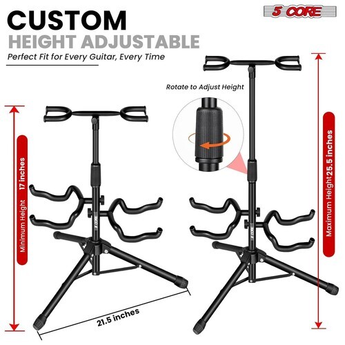 Keep your instruments safe, organized, and ready to play with the 5 Core Folding Guitar Stand. Built from durable metal with anti-corrosion paint, this universal floor guitar stand holds up to 2 guitars?perfect for electric, acoustic, bass, or even ukuleles. The adjustable height (17 to 25.5 inches) allows customized setup, while the tripod base and anti-slip feet ensure maximum stability.