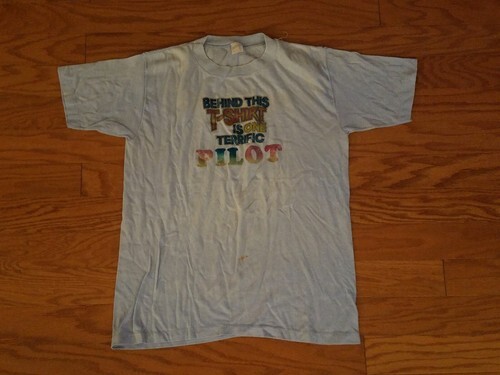 Zum Verkauf steht ein ?Hinter diesem T-Shirt verbirgt sich ein toller Pilot? aus den 1980er Jahren, N6059Q, glitzernde, blaue 50/50-Sportbekleidung zum Aufbügeln. Das Hemd ist auf der linken Schulter und am Bauch fleckig.