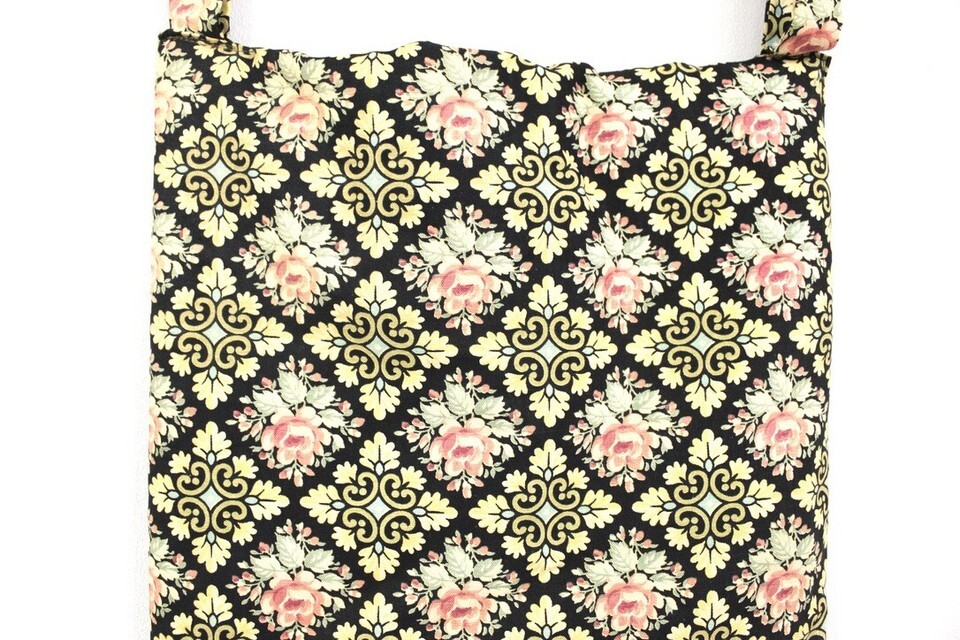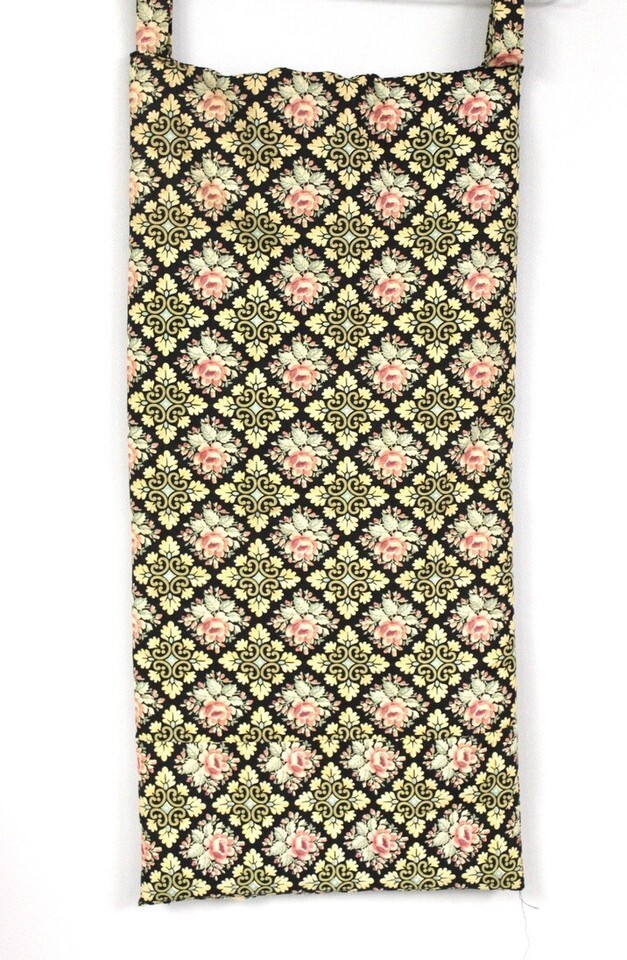 Beautiful handmade sort of heavy padded wall hanging with two straps to put a rod through. I am thinking it was used as a bulletin board or maybe hung photos on. Or maybe a bench pad. Lovely pink roses on black with gold and green and hint of turquoise.