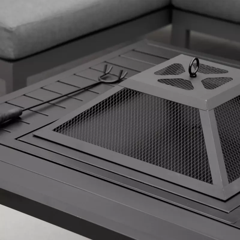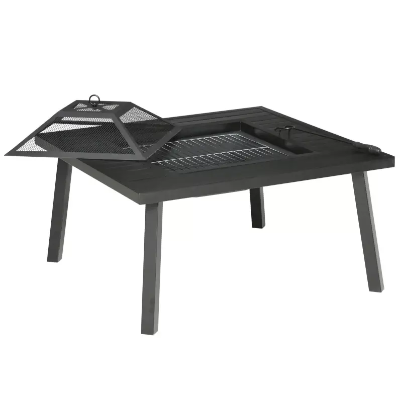 - Wood Burning Fire Pit with Grill Grate Info: Overall Size: 33.75" L x 32" W x 20.5" H. Internal Size: 18.5" L x 18.5" W x 4" H. Cover Size: 17.25" L x 17.25" W x 4" H. Grill Mesh Size: 16.25" L x 16.25" W. Poker Size: 16.5" L x 1.5" W. Waterproof cover included. Assembly required.