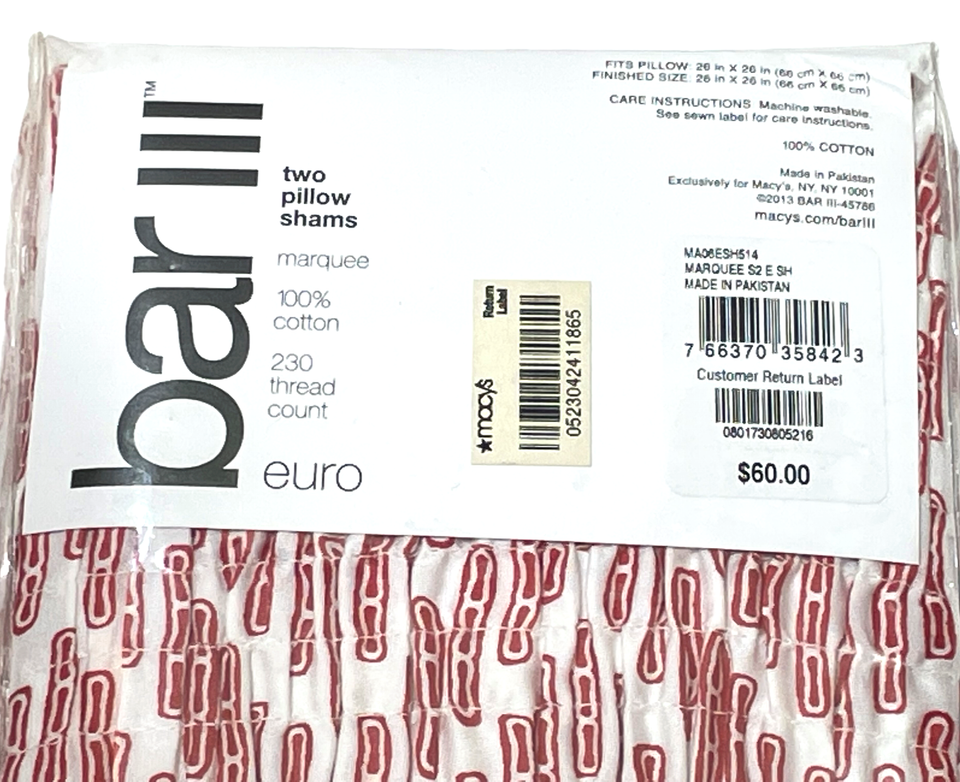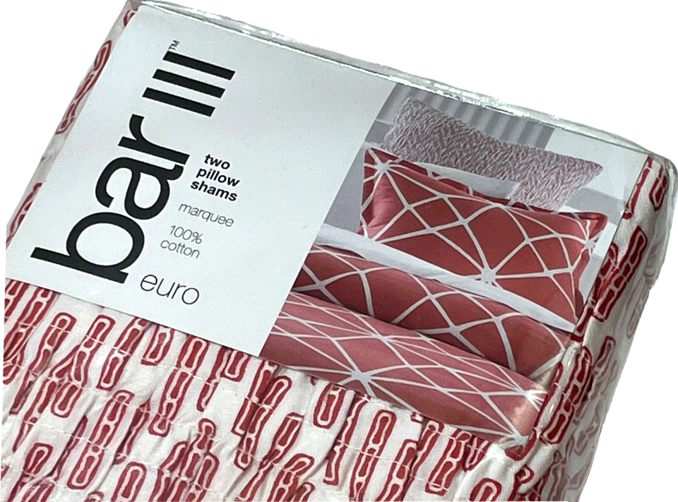 Bar III Marquee Euro Pillow Sham Set (2) 26 x 26" Red White Cotton 230 TC Modern
