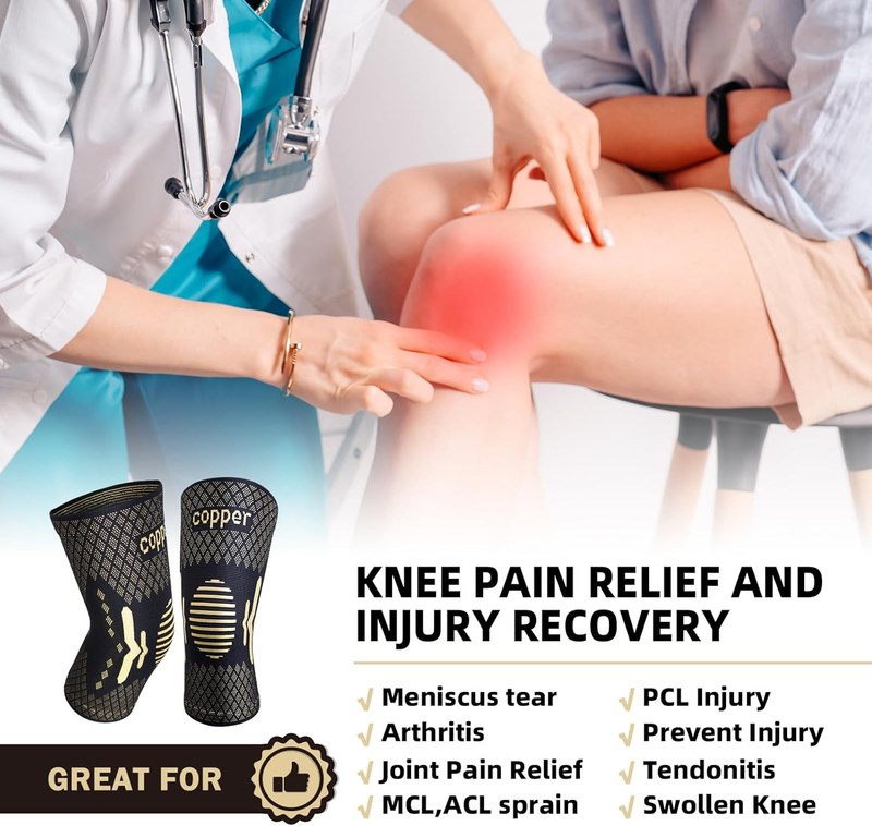 ?Pain Relief and Injury Recovery?Medical grade compression and high copper content, the knee braces can give your instant pain relief. Great copper knee brace for arthritis pain and support, improve blood circulation, reducing inflammation/swelling. Avert sports injury and speeding up recovery. The knee sleeves also keep your knee warm and reduce stiffness. Best knee compression sleeve offers optimum support for arthritis, meniscus tears, knee pain, ACL, MCL,sports injury recovery.