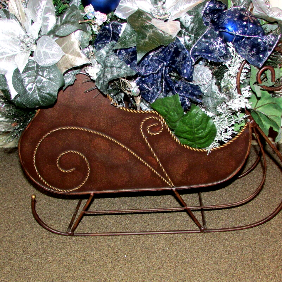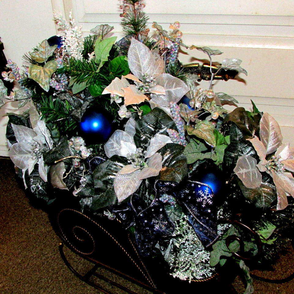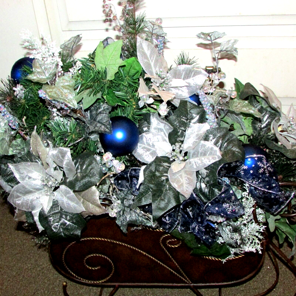 metal brown SLEIGH w/green pine, white-silver poinsettias berries foliage blue