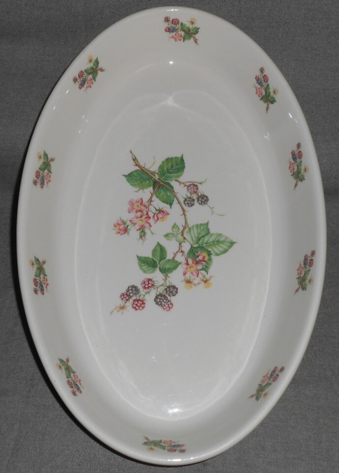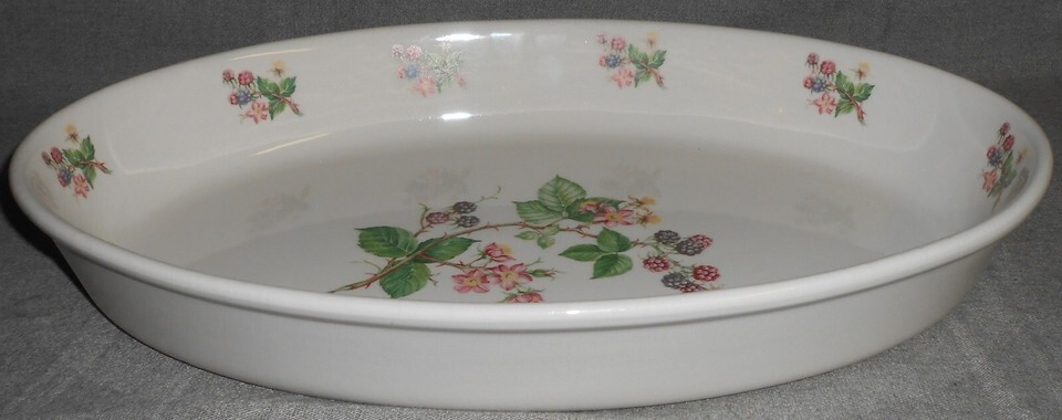 This is the large Oval Baking Dish that measures approx 14 1/2" x 9 1/2" x 2" (deep) from Portmeirion in the Dog Rose Pattern with the Blackberry Vine and Floral Motif. It was Made in England and it is in good pre-owned condition with no chips or cracks.