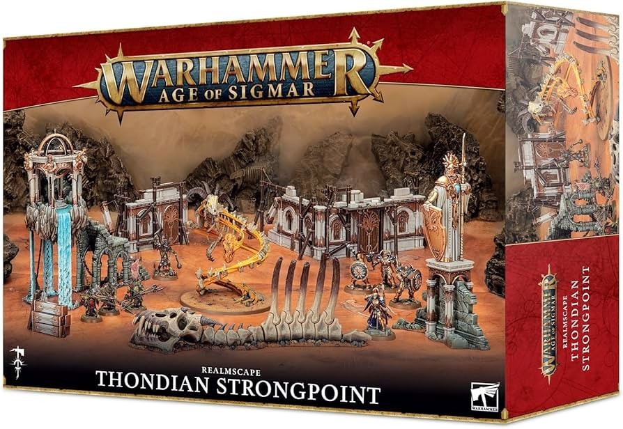 Realmscape: Thondian Strongpoint is a battlefield in a box for Warhammer Age of Sigmar, comprising a range of scenery pieces and gaming boards inspired by the Ghurish alpha-continent of Thondia. It also includes the Krondspine Incarnate of Ghur ? a powerful, unpredictable monster born from the energies of Ghur itself that can be added to armies of any faction. This varied assortment of half-built outposts, ominous skeletons, and exotic wonders is fully compatible with existing scenery, making the Thondian Strongpoint an excellent way to start or expand your terrain collection ? it will also save you money compared to buying the contents individually.