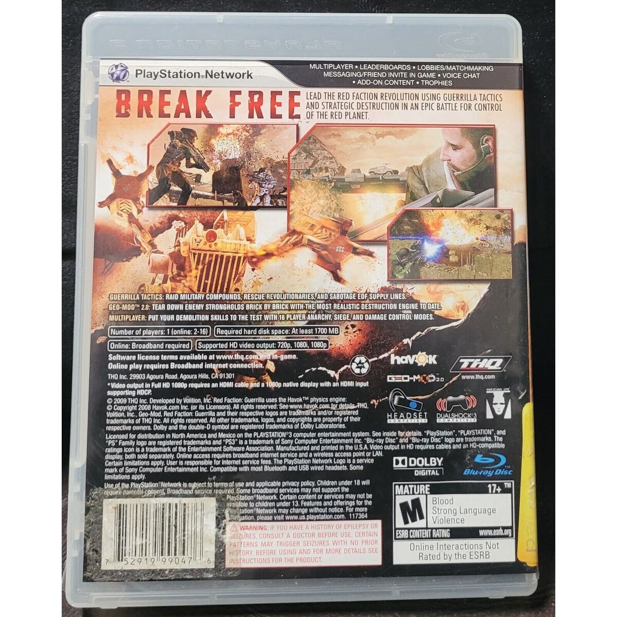 Immerse yourself in the thrilling world of Red Faction: Guerrilla for PlayStation 3. This action-packed game, released in 2009, is set in a region-free world and offers online playability. The game's mature rating makes it suitable for players aged 17 and above. Explore the vast open world, engage in intense battles, and interact with fellow players in this first-person shooter game. The game comes with a manual and is published by Sony. Get your hands on this exciting game and join the Red Faction series today.
