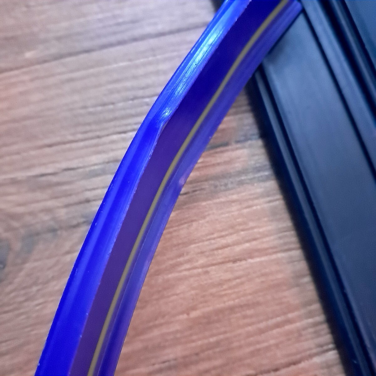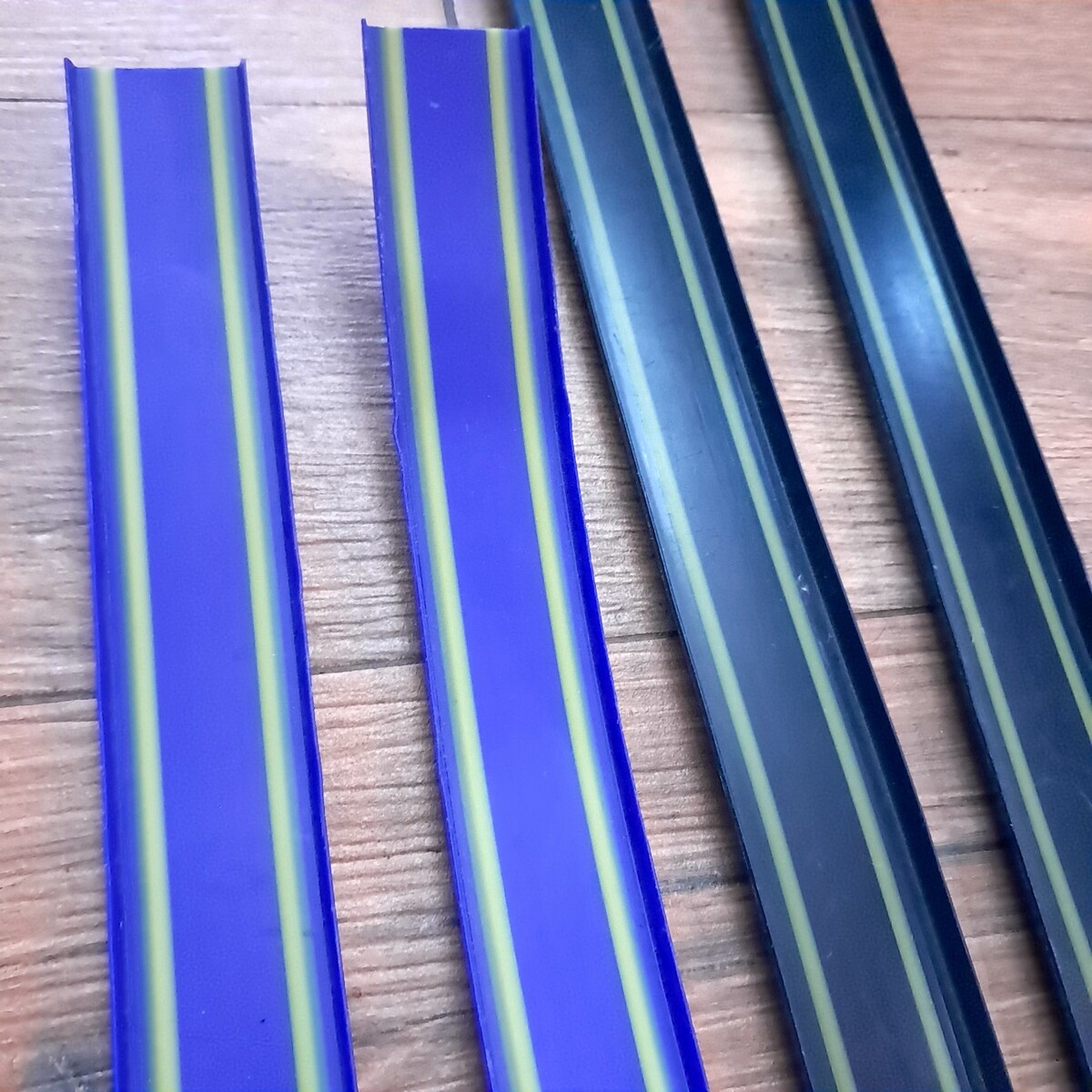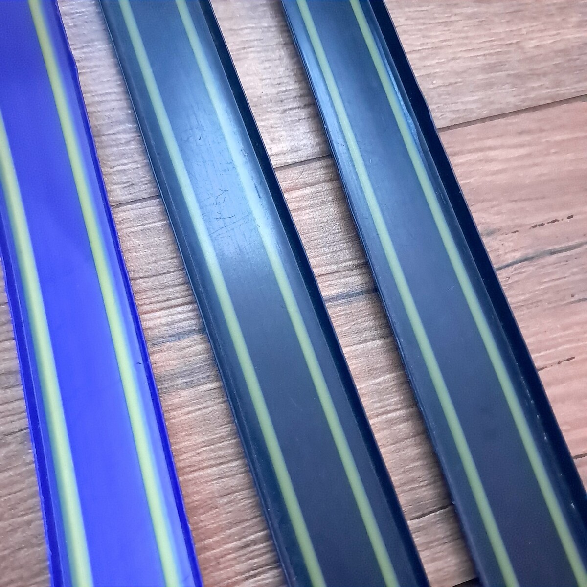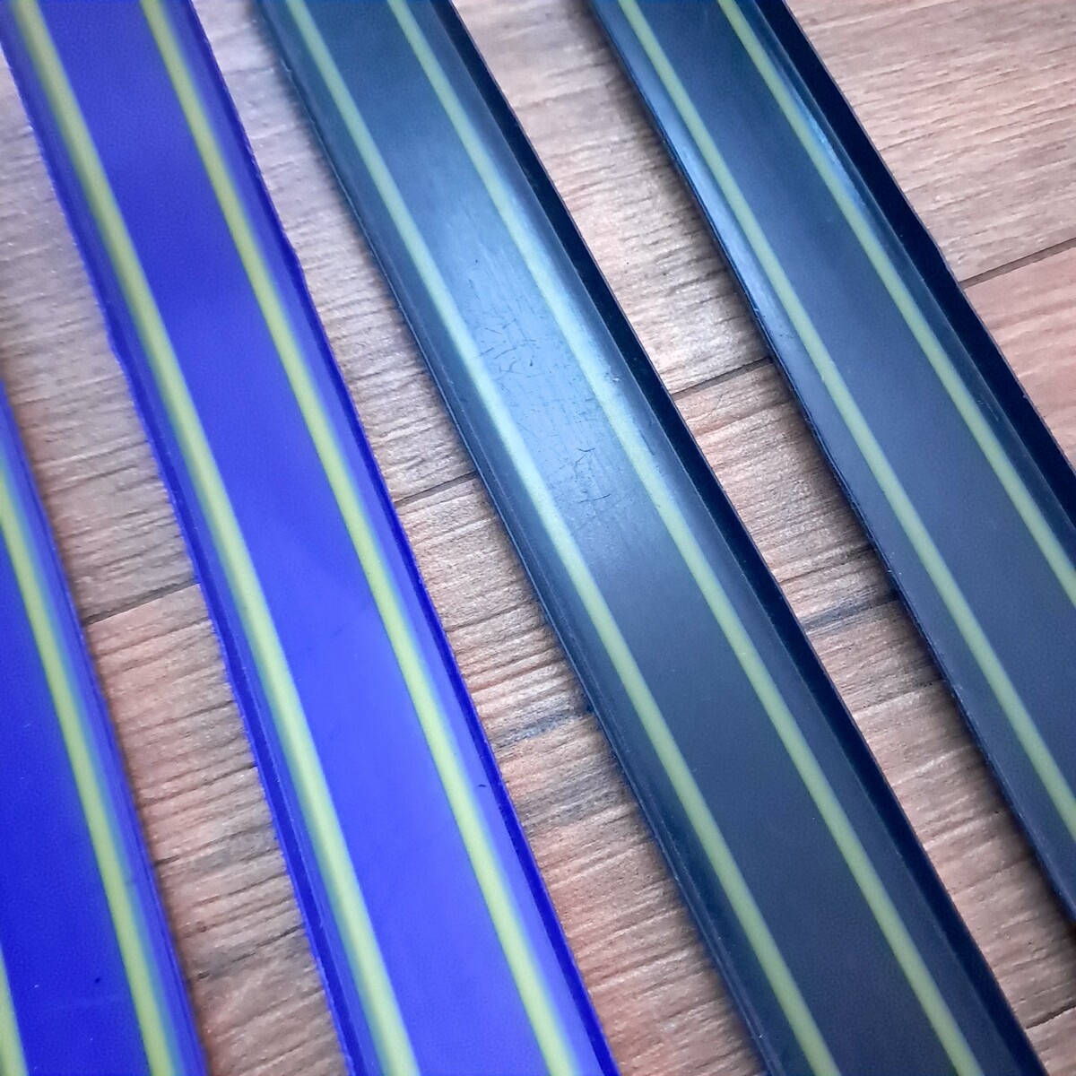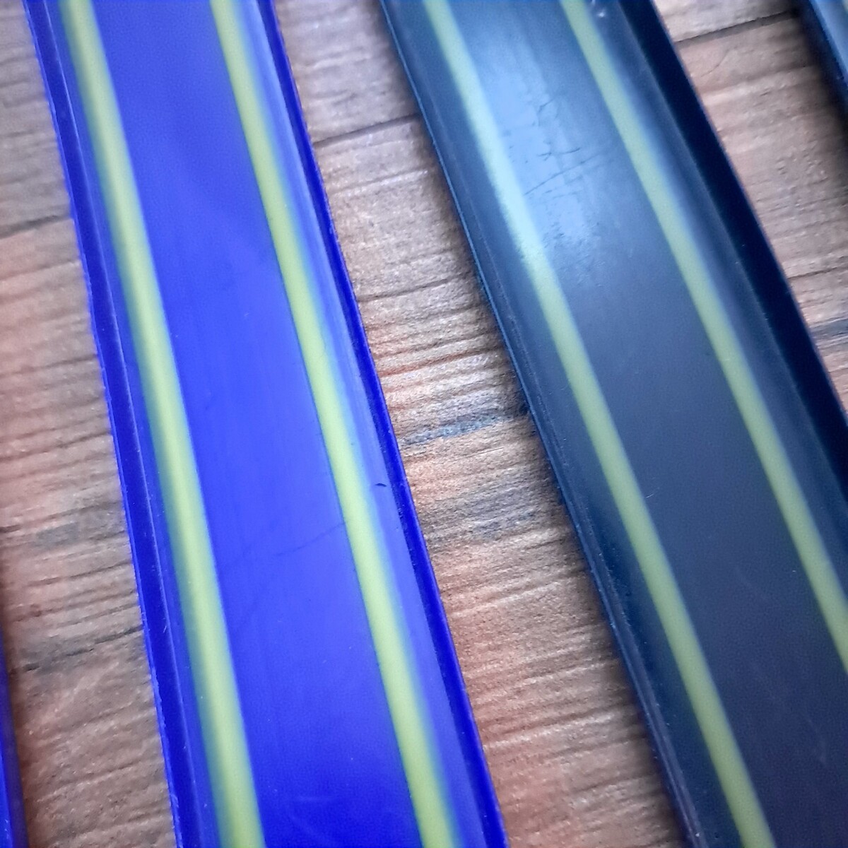 Not sure if this is hot wheels track or from the Kenner Fast 111's Burn Out Alley set. Includes 2 long darker/navy track pieces and 2 royal blue pieces(some bending as shown, but could be flattened) Both have green/yellow stripes. See pics for measurements.