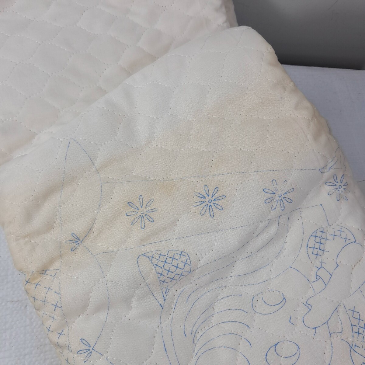 Some discoloration/yellowing as shown. Stitching has been started as shown. Includes thread but not sure if it is all there. See pics.