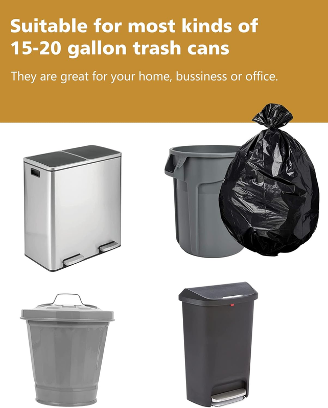 Our 20-gallon large black trash bags are suitable for various styles of 20 gallon trash can, such as traditional round or square trash bins. This multi-functional trash bag is easy to use that are suitable for different usage scenarios.