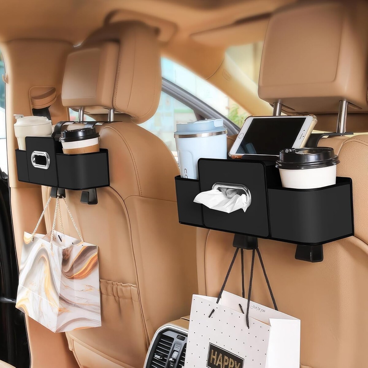 4-in-1 functionality: a tissue holder (comes with 1 pack of 80 tissues), seat back hook, phone holder, and car seat cup holder.