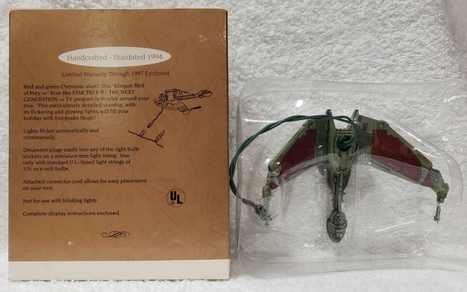 1 Brand New In Original Box *Box Has a Few Scuffs, Scratches Dents* Unsealed Full Size Ornament by Hallmark Keepsake KLINGON BIRD OF PREY Star Trek The Next Generation! Magic! Flickering Lights! Red and Green Christmas Alert! Lights Flicker Automatically and Continuously! Comes with Instruction Sheet! Original! Discontinued Hard to Find! 100% Authentic! RARE!