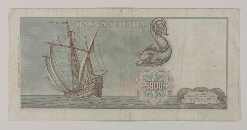 1964 Italy 5000 Lira Note / Banca d'Italia Cinquemila Lire, Christopher Columbus